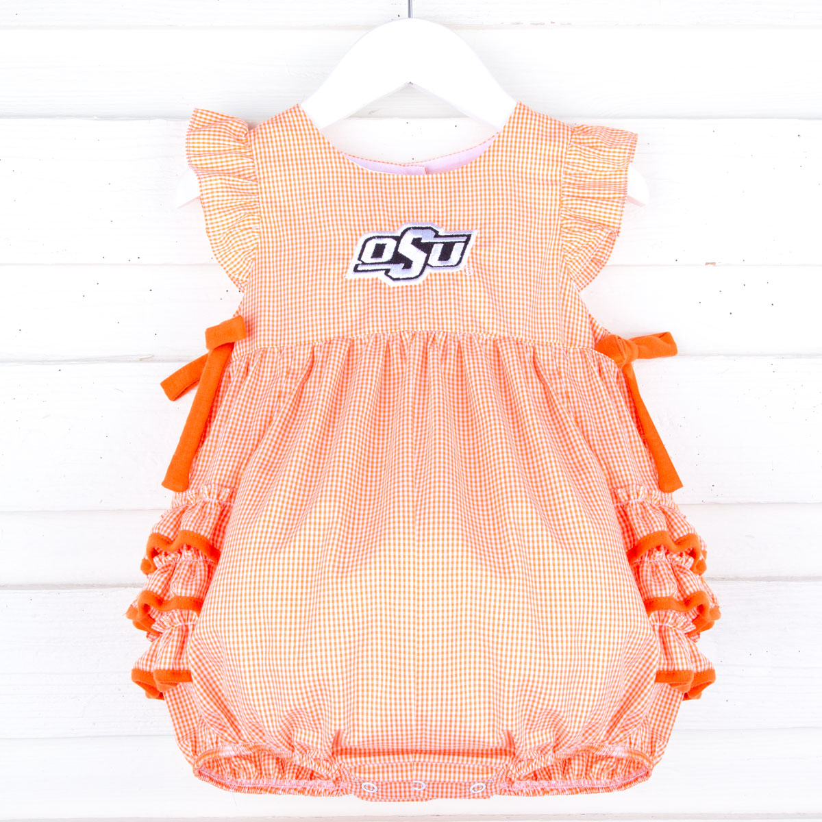 It's game time! Get your little one ready for football season in style with our Oklahoma State Embroidered Orange Ruffle Bubble. This adorable gingham bubble features the OSU embroidered logo, sweet orange side-tie bows, and fluttered sleeves. With convenient snaps in stride and back buttons for closure, it's as practical as it is cute!
