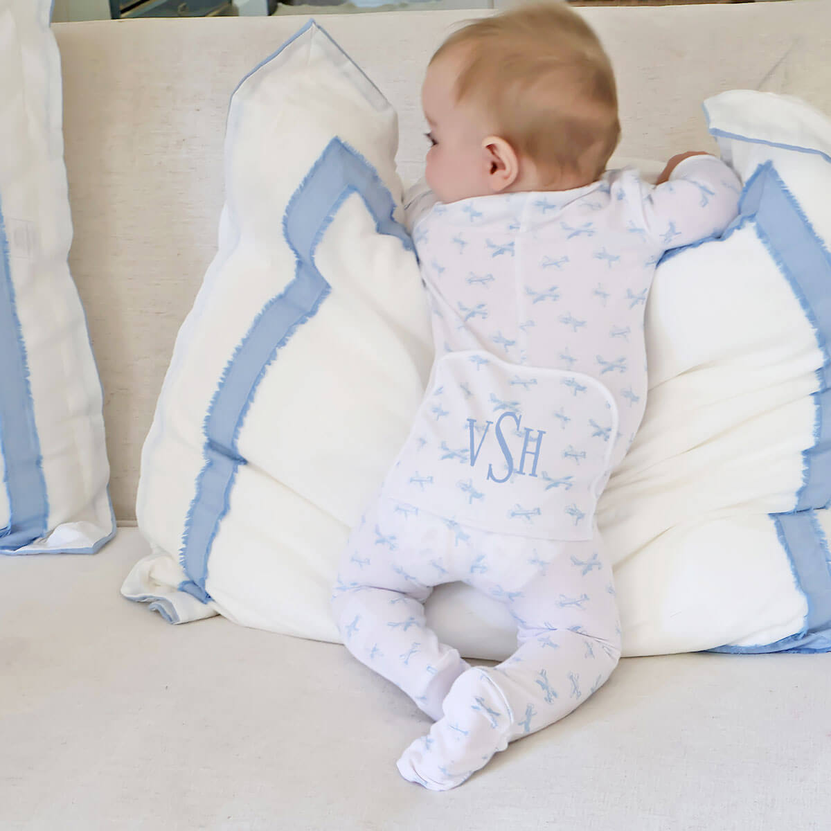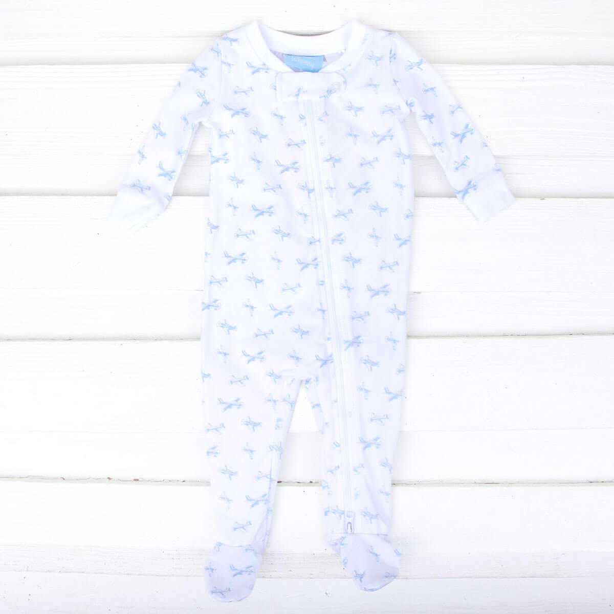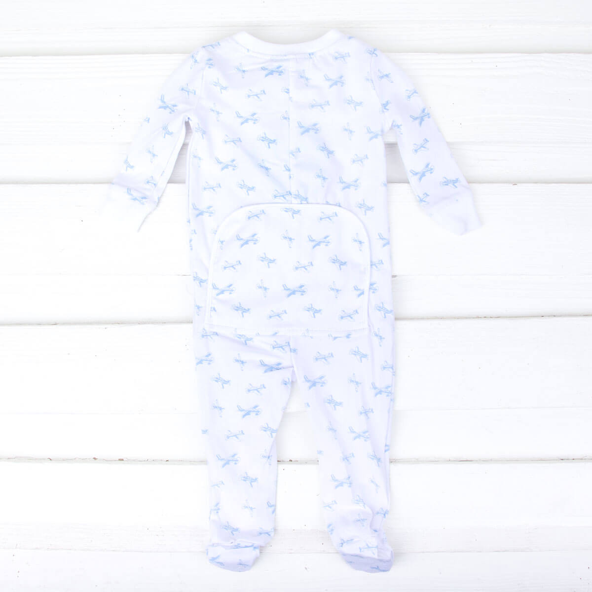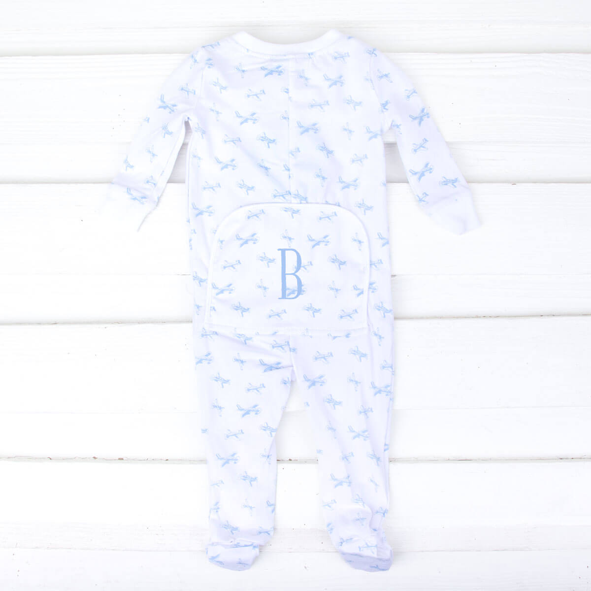 Get ready for bedtime in the coolest Airplane Print Zip Sleeper. This long-sleeve sleeper features an airplane print with white ribbing. The easy zip-up front closure makes dressing your little one simple, while the footed design keeps their feet warm and cozy. Soft and snuggle-ready, this sleeper can be personalized with a monogram for an extra special touch.