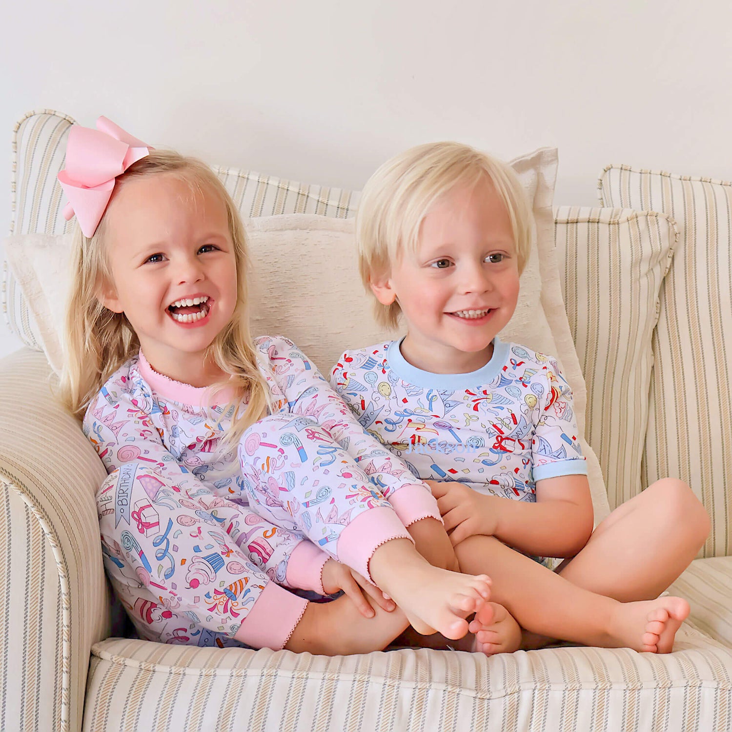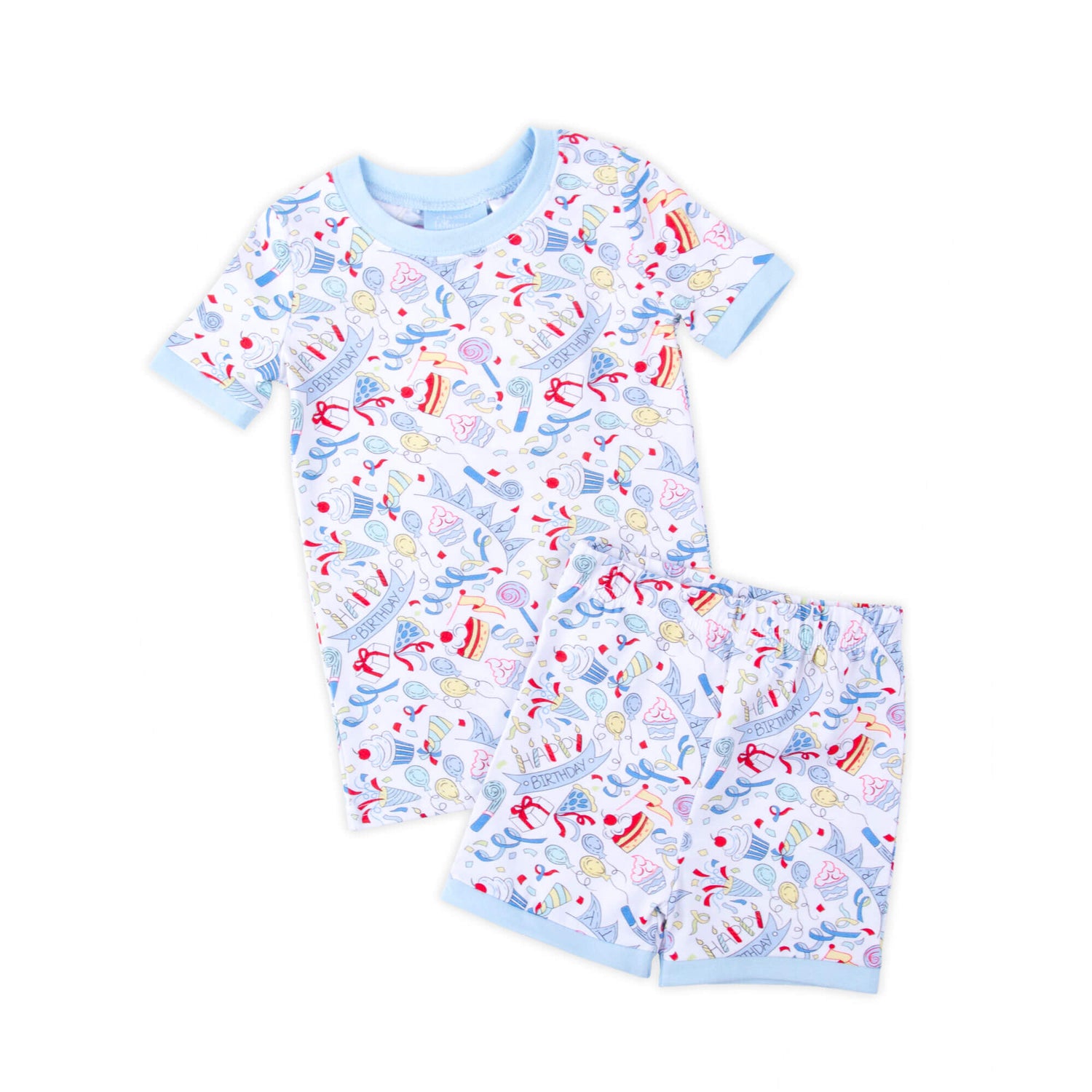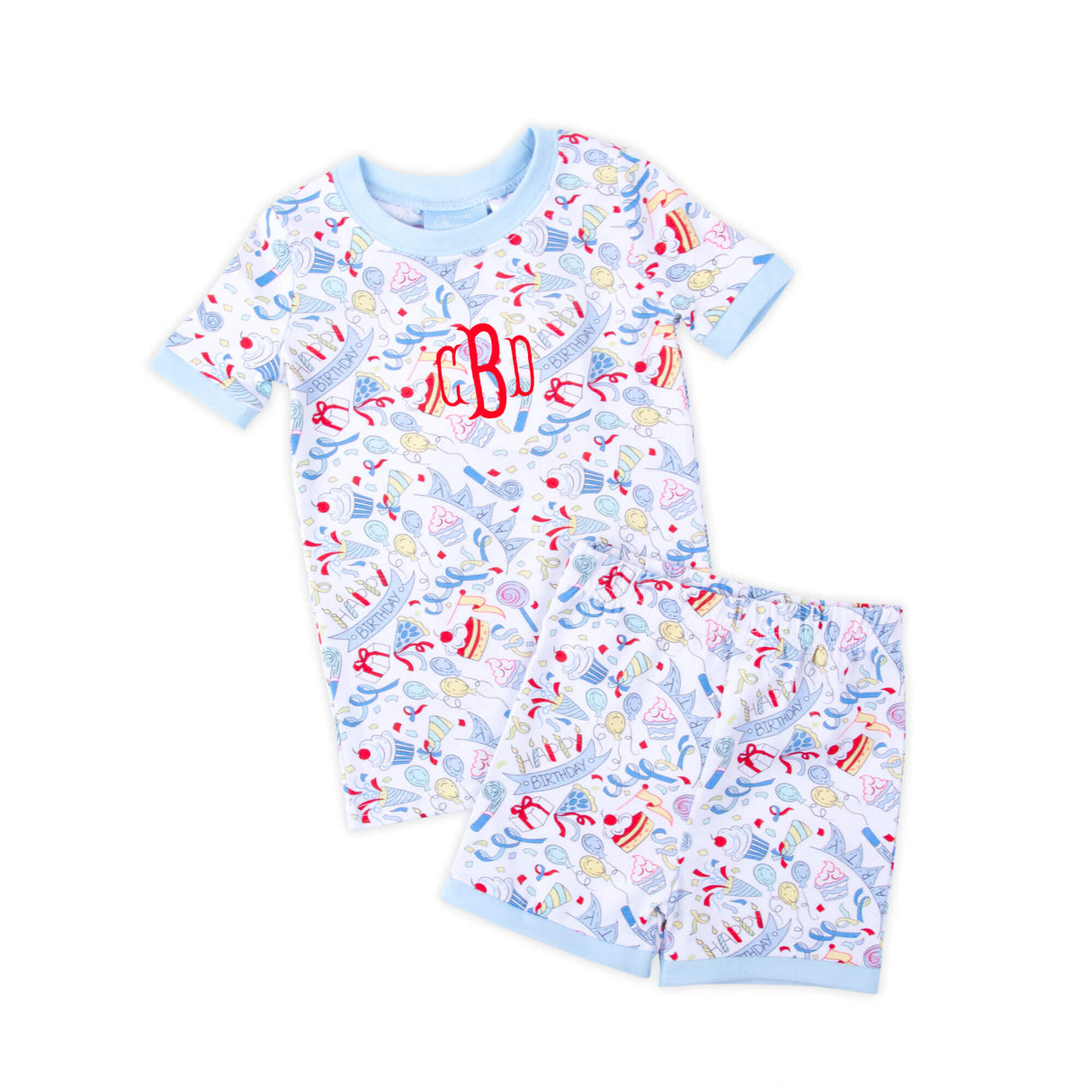 Celebrate a big birthday in our adorable Birthday Boy Short Pajamas! Featuring the cutest birthday-themed print, this soft set includes a short-sleeve pajama top and matching shorts with light blue ribbing. Snuggle-ready and perfect for sweet birthday dreams, these PJs can be personalized with a monogram for an extra special touch!