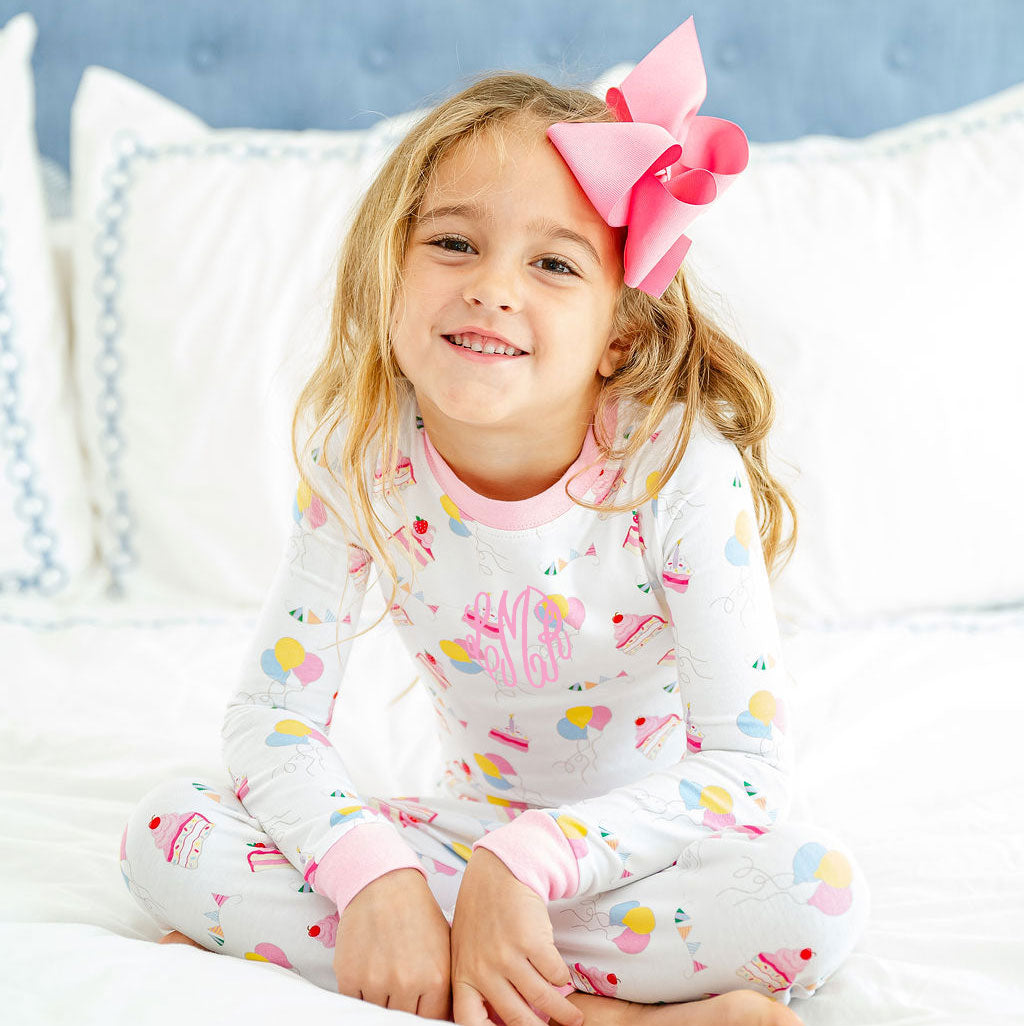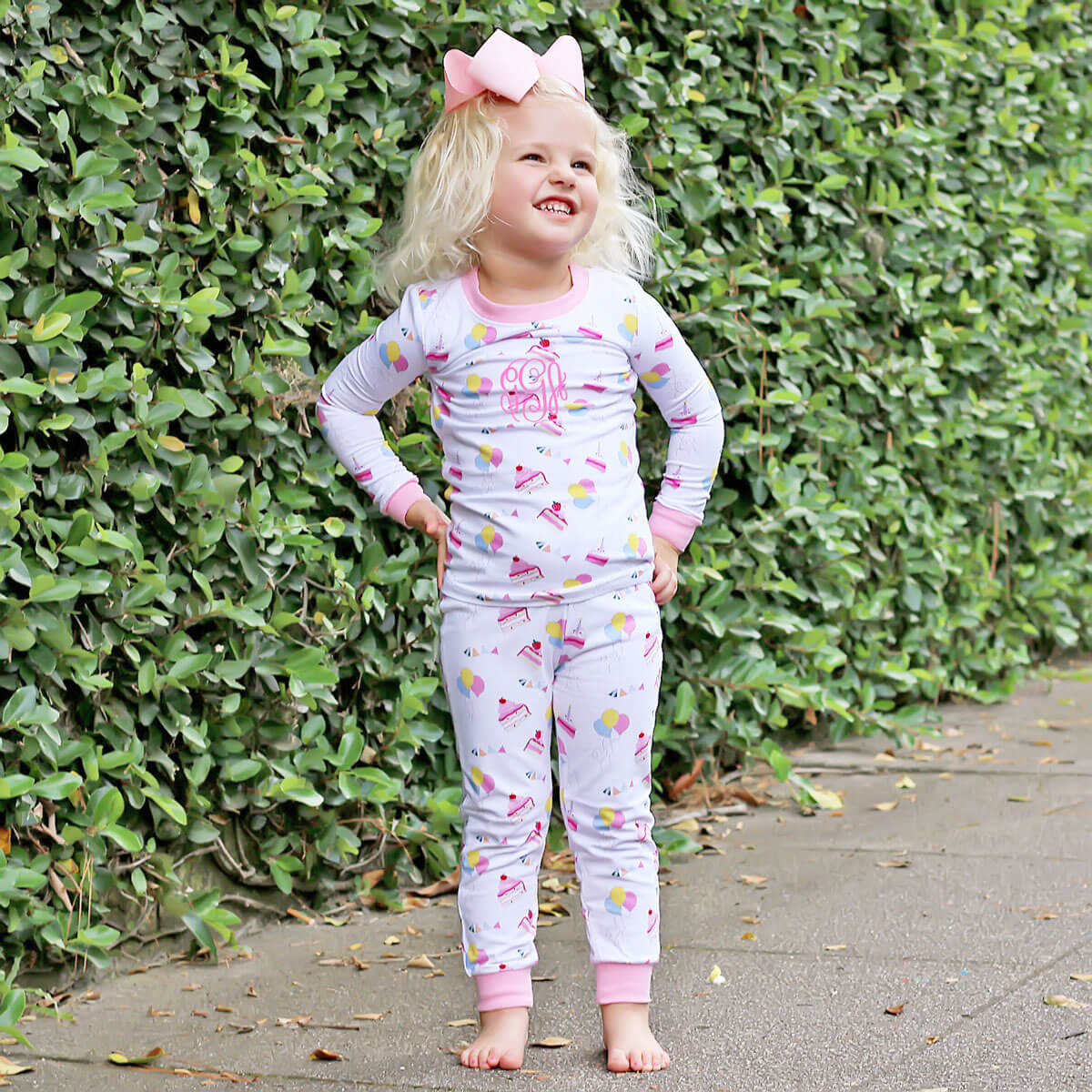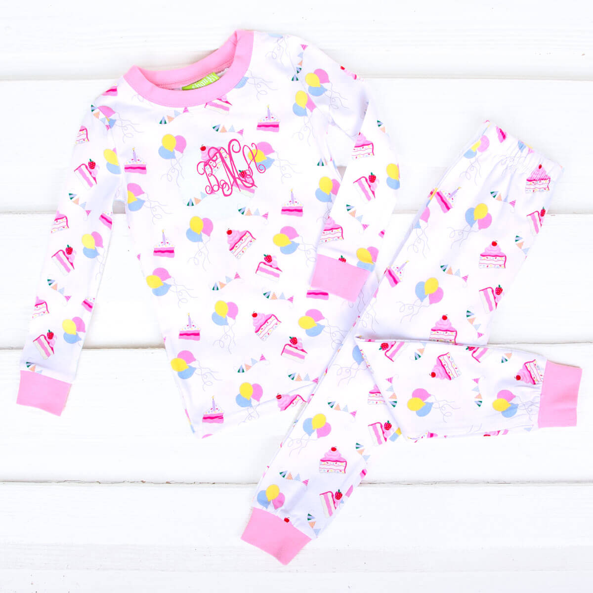 Your little one will be warm and comfortable sleeping in our Birthday Cake Pajamas. Features the cutest birthday print with a cake and balloons. Makes the perfect birthday gift! Make these pajamas extra cute by adding a monogram!