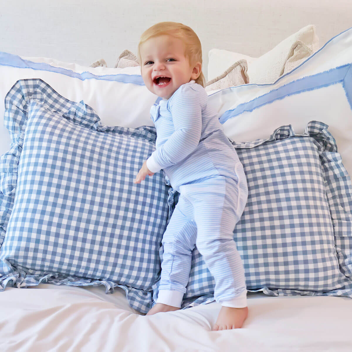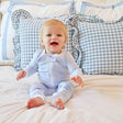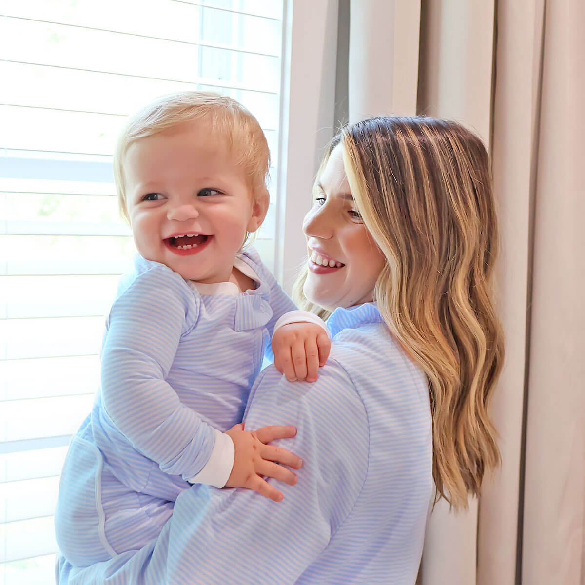 Your little one will be comfortable dreaming in this Blue and White Stripe Zip Sleeper. The blue stripe knit onesie pajama is the softest and most comfortable for your little one. A perfect weight for all seasons! Easy zip-up front zipper. Back flap is sewn down. Makes a great baby gift! Don't miss our coordinating nightgowns and robes for mom and pajamas for big brother or sister!