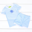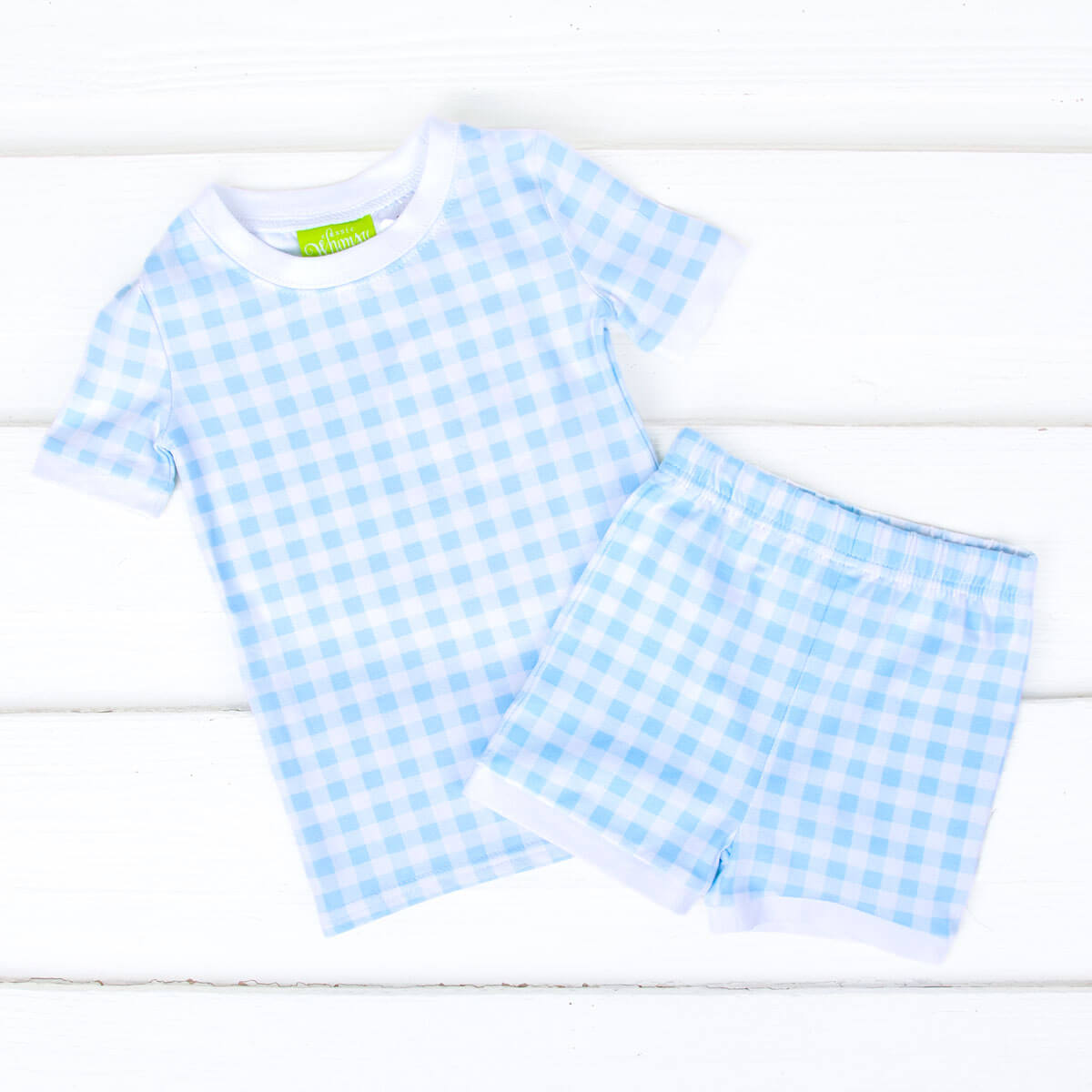 Ensure your little one stays warm and comfortable while sleeping in our Blue Gingham Short Pajamas. With a charming blue gingham print and white ribbing, this set is designed for nighttime comfort. It includes a cozy short-sleeve pajama top and matching pull-on pajama shorts, making it perfect for all seasons. Make these pajamas extra special by adding a monogram to personalize your little one's sleepwear!