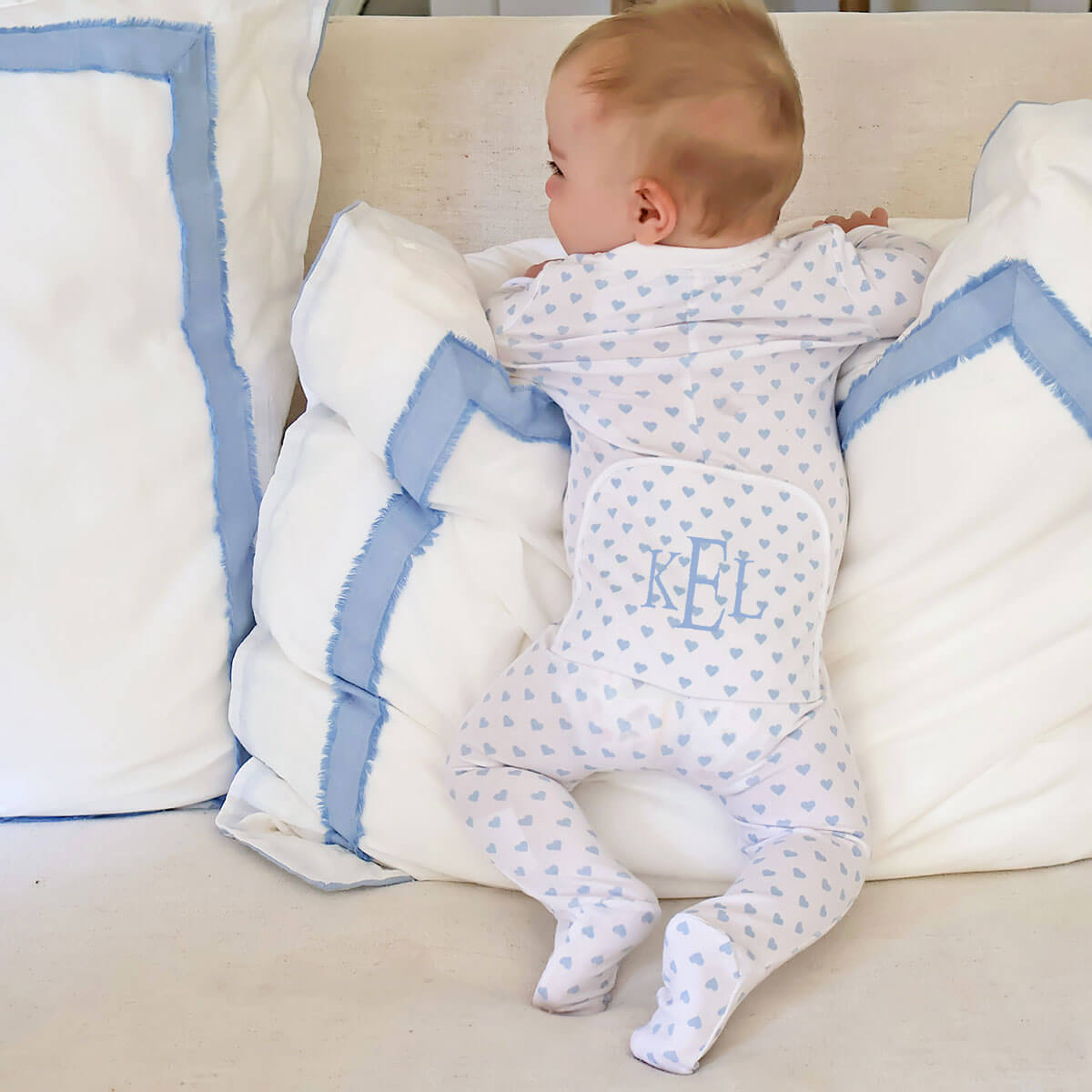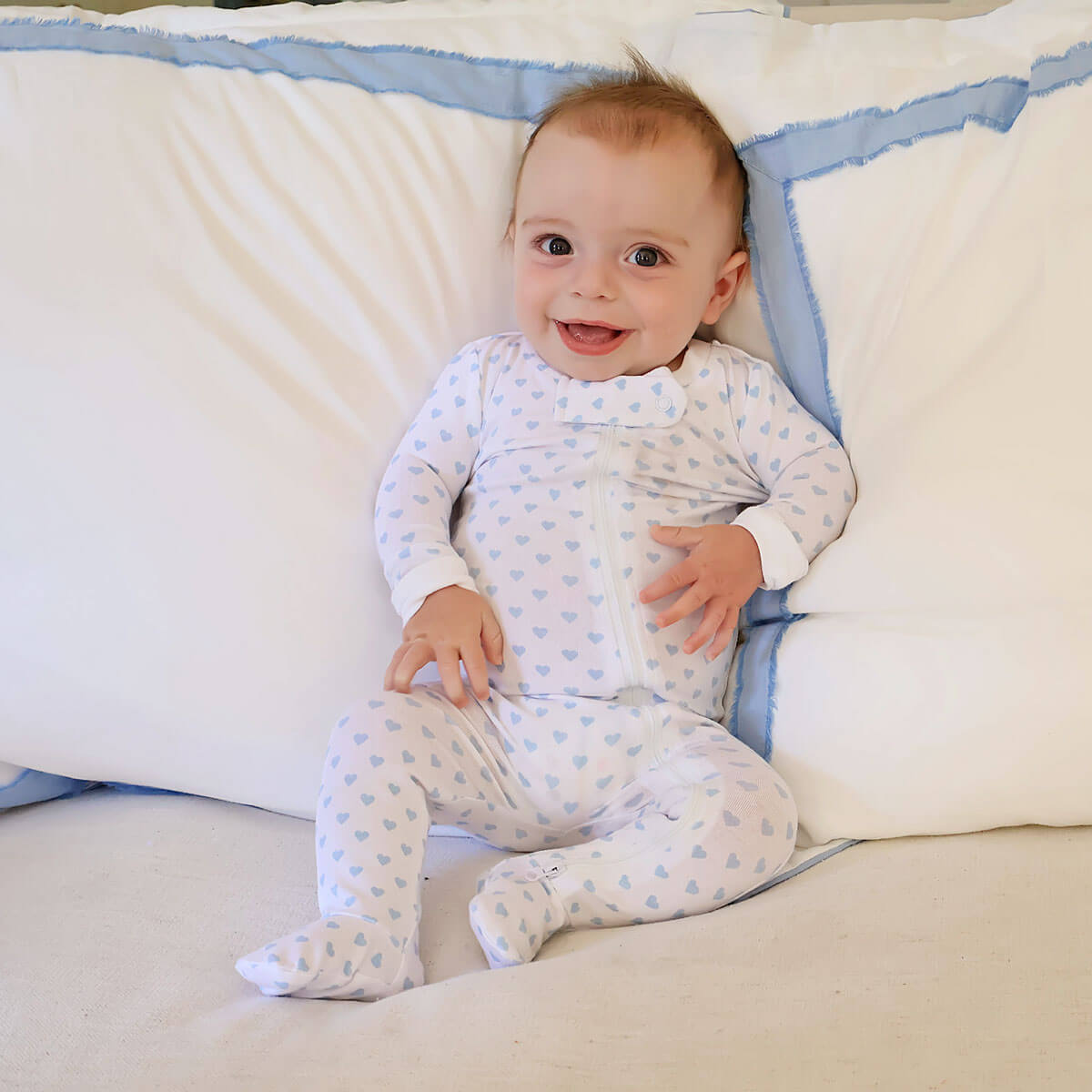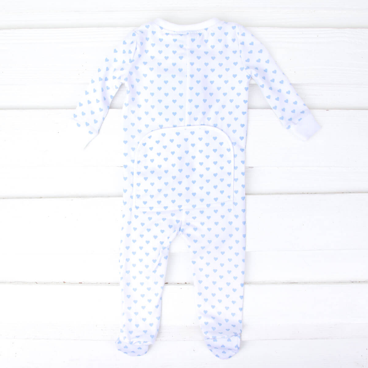 Get ready for bedtime in the sweet Blue Heart Print Zip Sleeper. This long-sleeve sleeper features a blue heart print with white ribbing. The easy zip-up front closure makes dressing your little one simple, while the footed design keeps their feet warm and cozy. Soft and snuggle-ready, this sleeper can be personalized with a monogram for an extra special touch.