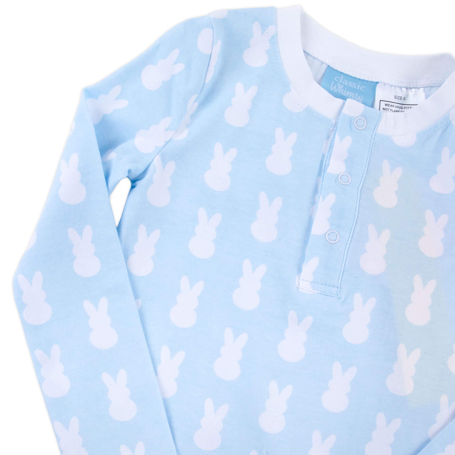 Wrap your little one in comfort for cozy nights with our Bunny Peeps Light Blue Henley Pajamas. Ideal for Spring and Easter, this unisex PJ set features a playful bunny peep print with white trim. The set includes a long sleeve henley pajama top and matching pull-on pajama pants. Personalize these pajamas with a monogram for an adorable and unique touch!
