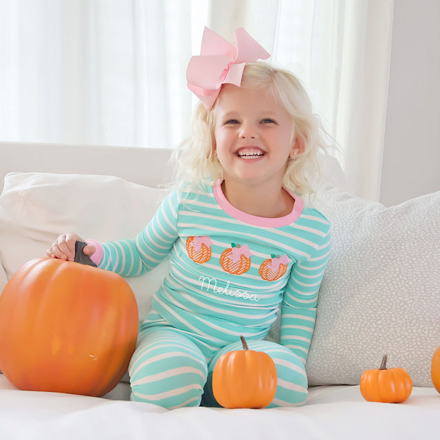 Your little one will be dreaming of the pumpkin patch in our Pumpkin Bows Turquoise Stripe Pajamas. Made from a soft turquoise stripe, this long-sleeve pajama top features three cute pumpkin appliqués with pink bows. Add a name monogram below the appliqués for a personalized touch!