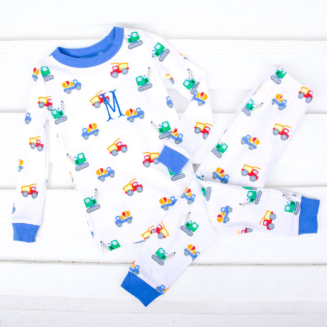 Your little builder will adore our Construction Truck Pajamas. These fun pajamas feature cool construction truck print, including a dump truck, a crane, and a cement truck, making them a fun and stylish choice for bedtime. The set includes a cozy long-sleeve pajama top and matching pull-on pajama pants, providing the perfect combination of comfort and style. Personalize these pajamas with a monogram for an adorable touch! Whether it's for a good night's sleep, lounging, or simply enjoying a comfortable bedtime routine, your little one will love these pajamas.