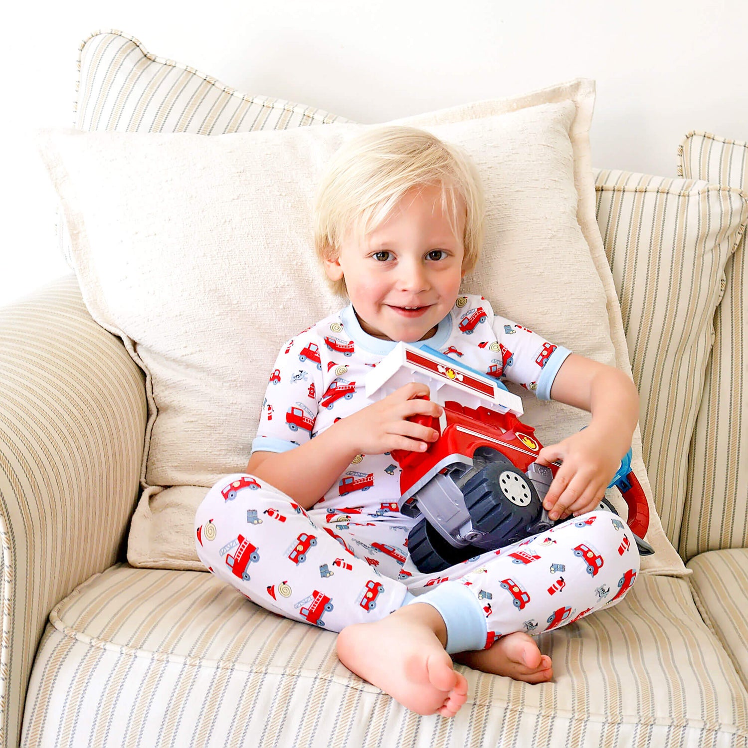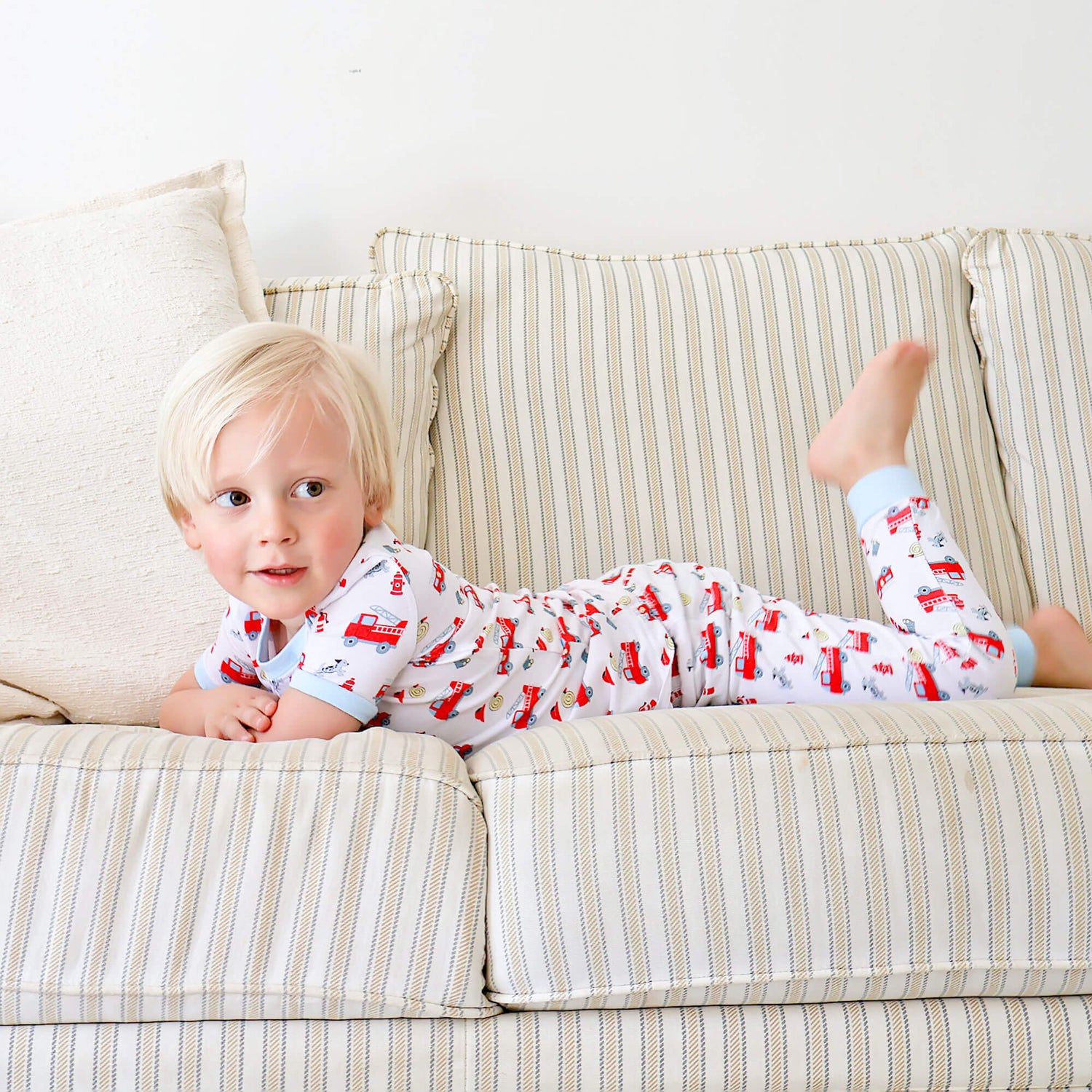 Your little firefighter will love bedtime in our adorable Fire Truck Pajamas! Featuring a playful firetruck print, this soft set includes a short sleeve pajama top and matching pajama pants with light blue trim. Snuggle-ready and perfect for cozy nights, these PJs can be personalized with a monogram for an extra special touch!