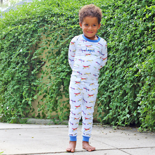 Your future little pilot will love sleeping in this Flying Airplanes Pajamas. These are the softest and most comfortable pajamas! Features the coolest airplane print with blue ribbing. The set includes a cozy long sleeve pajama top and coordinating pull-on pajama pants. Make these pajamas extra cute by adding a monogram!