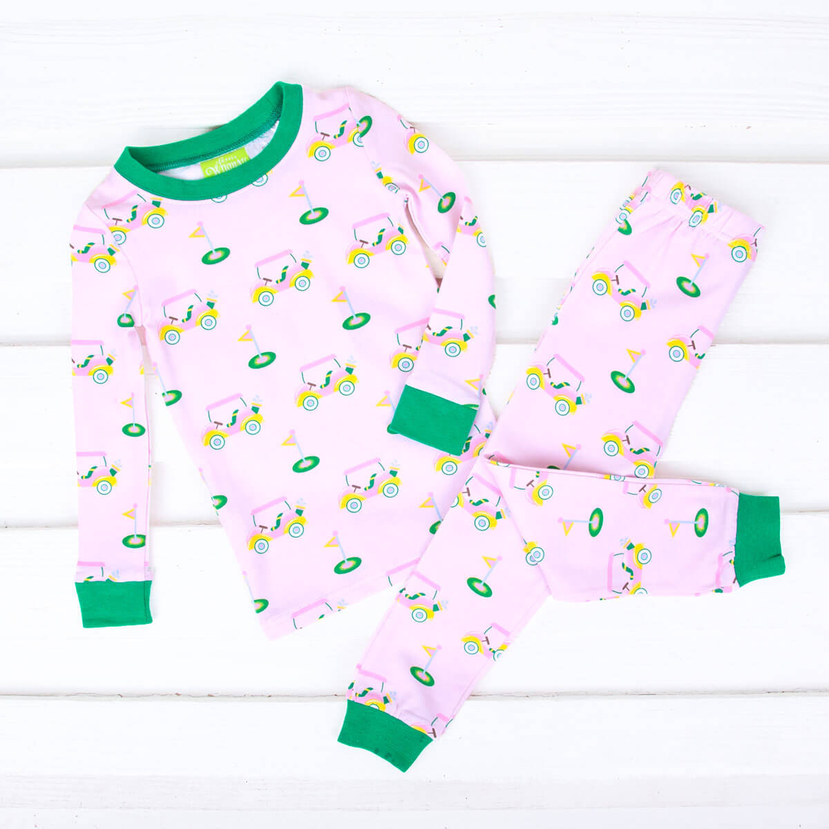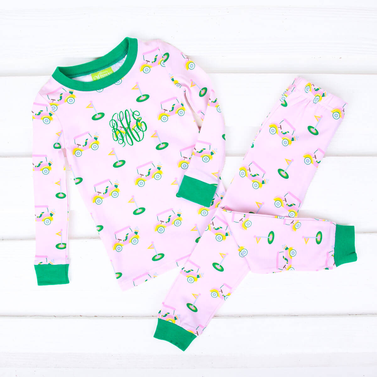 Introduce your little one to the world of golf with our Golf Cart Pink Pajamas. The pajamas feature a delightful golf scene print with a golf cart. Designed for nighttime comfort, the set includes a cozy long-sleeve pajama top and matching pull-on pajama pants. Make these pajamas extra special by adding a monogram to personalize your little one's sleepwear!