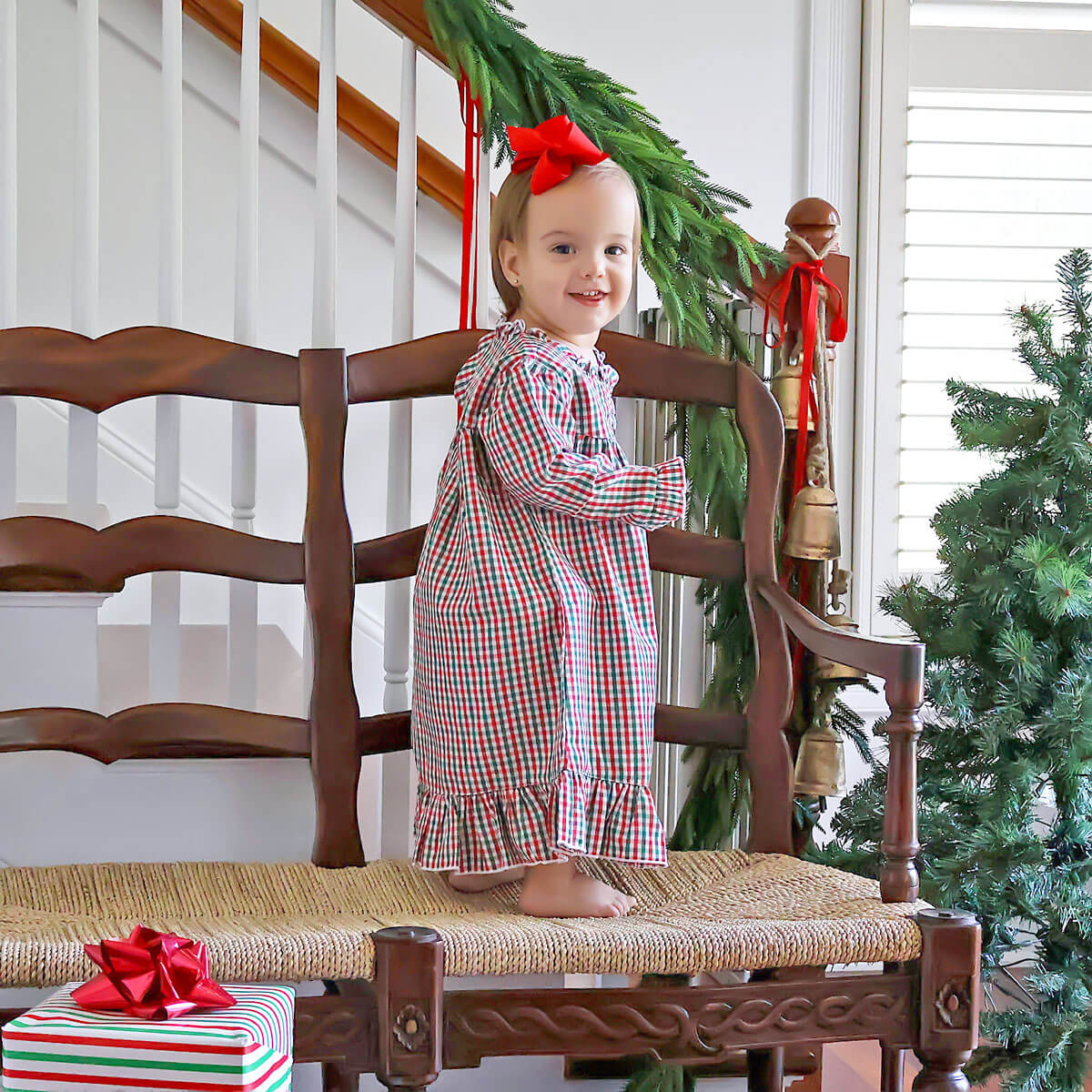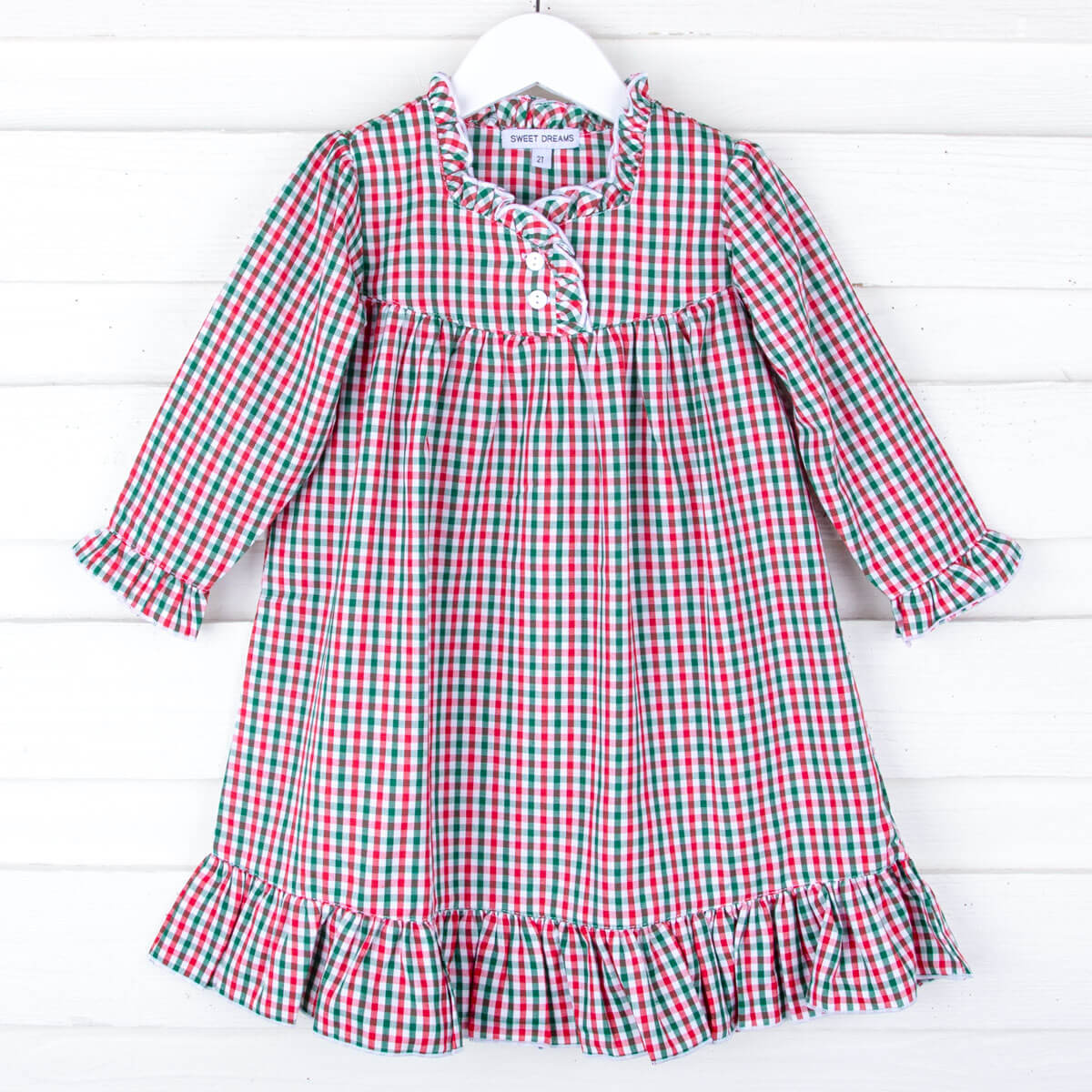 Celebrate the magic of Christmas morning in this Green & Red Gingham Nightgown. This charming nightgown features ruffle details, front buttons, and a festive holiday feel. Add a monogram for a personalized touch.