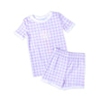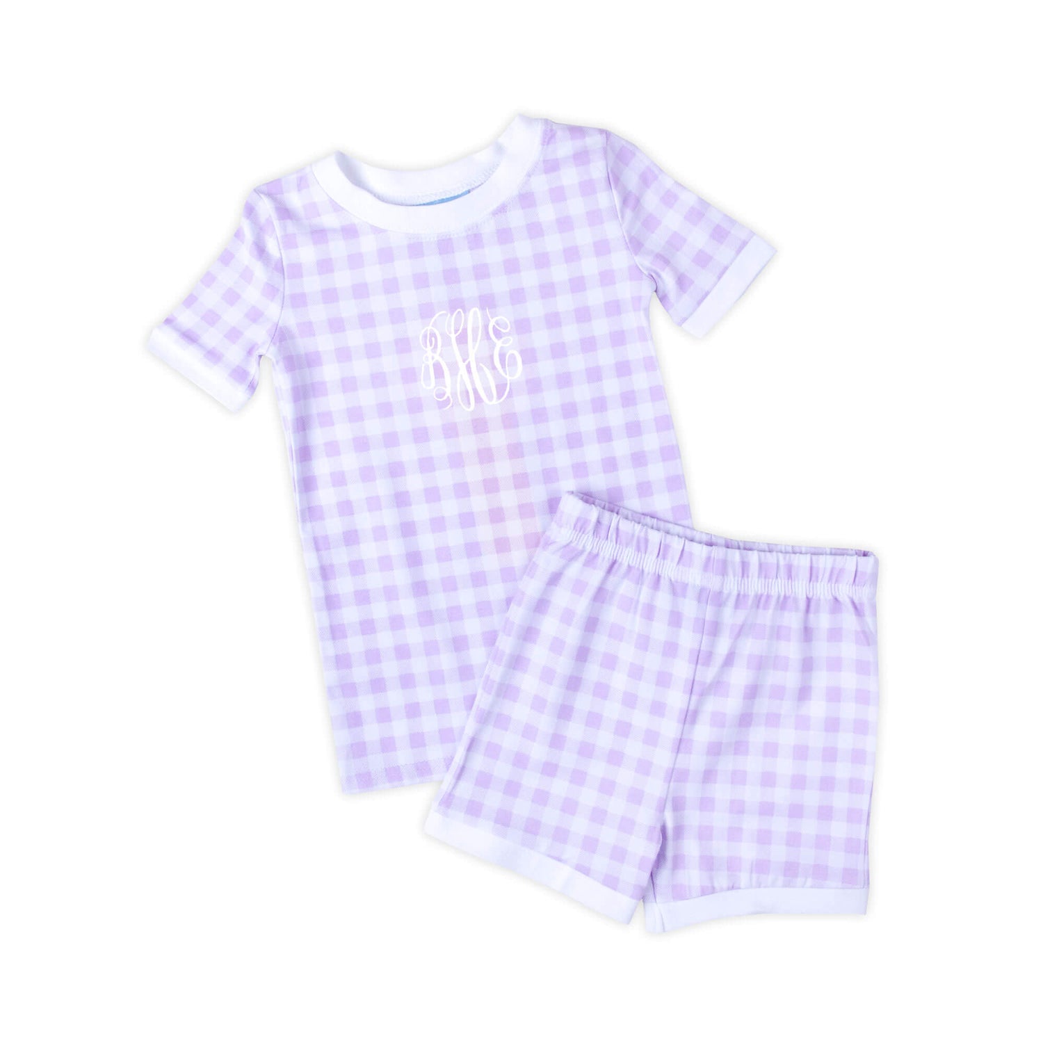 Your little one will be snug and comfortable in our Lavender Gingham Short Pajamas. Featuring a charming lavender gingham print and white ribbing, this set includes a cozy short-sleeve pajama top and matching pull-on shorts, perfect for any season. Make these pajamas even more delightful by adding a monogram for a special touch!