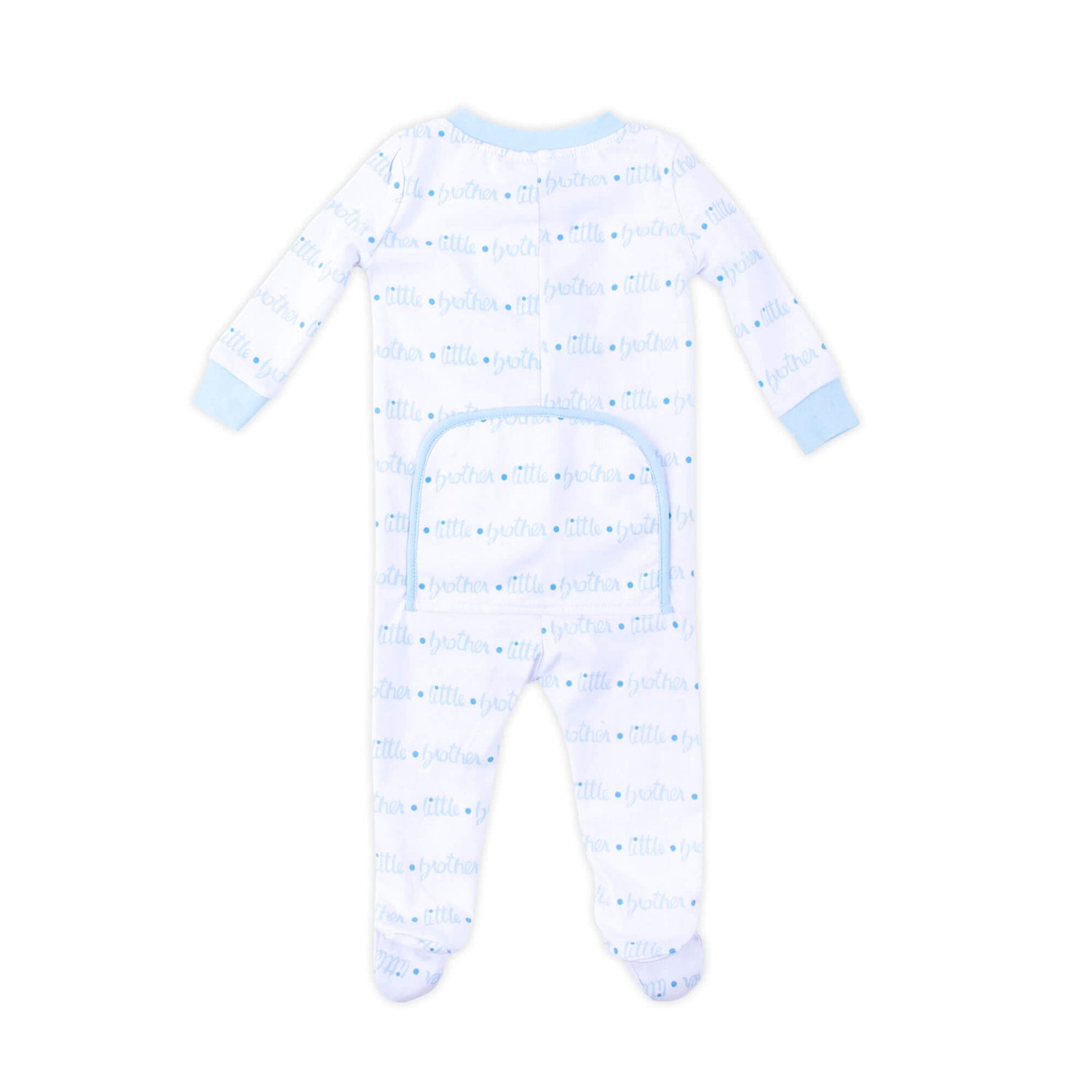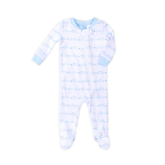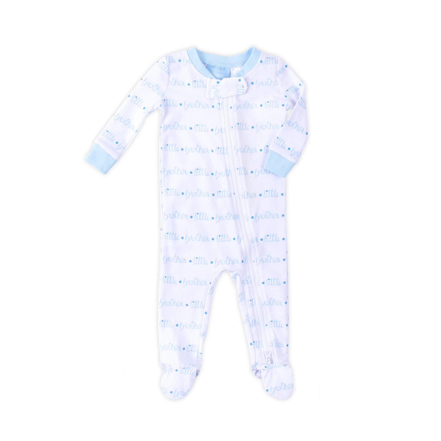 Get ready for bedtime fun with our Little Brother Zip Sleeper! This sweet onesie features an adorable blue "little brother" print with blue ribbing. Designed for ultimate comfort and ease, it has a zip-up front and a sewn-down back flap. Available in footed only. Add a monogram for that extra special touch to make it even sweeter!