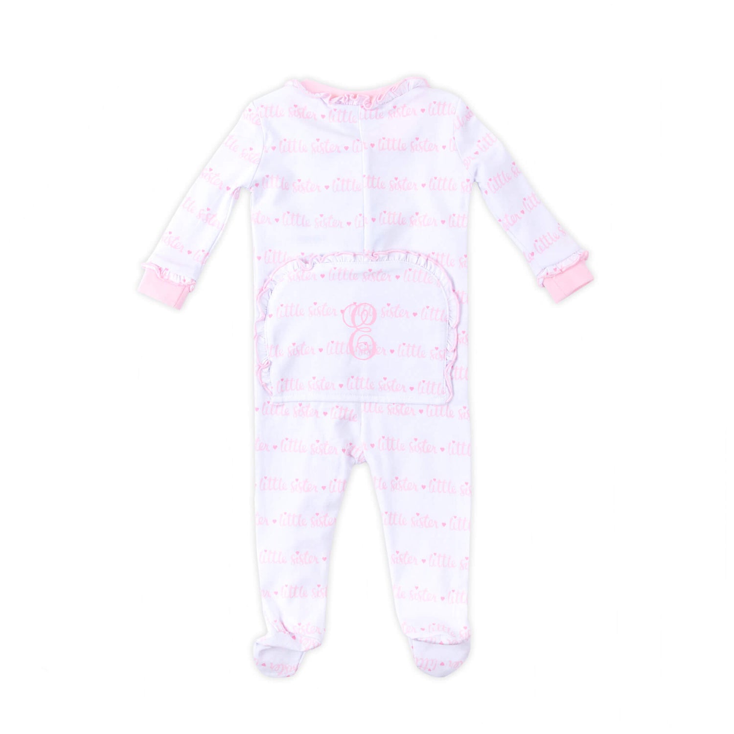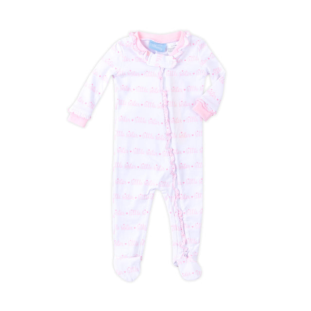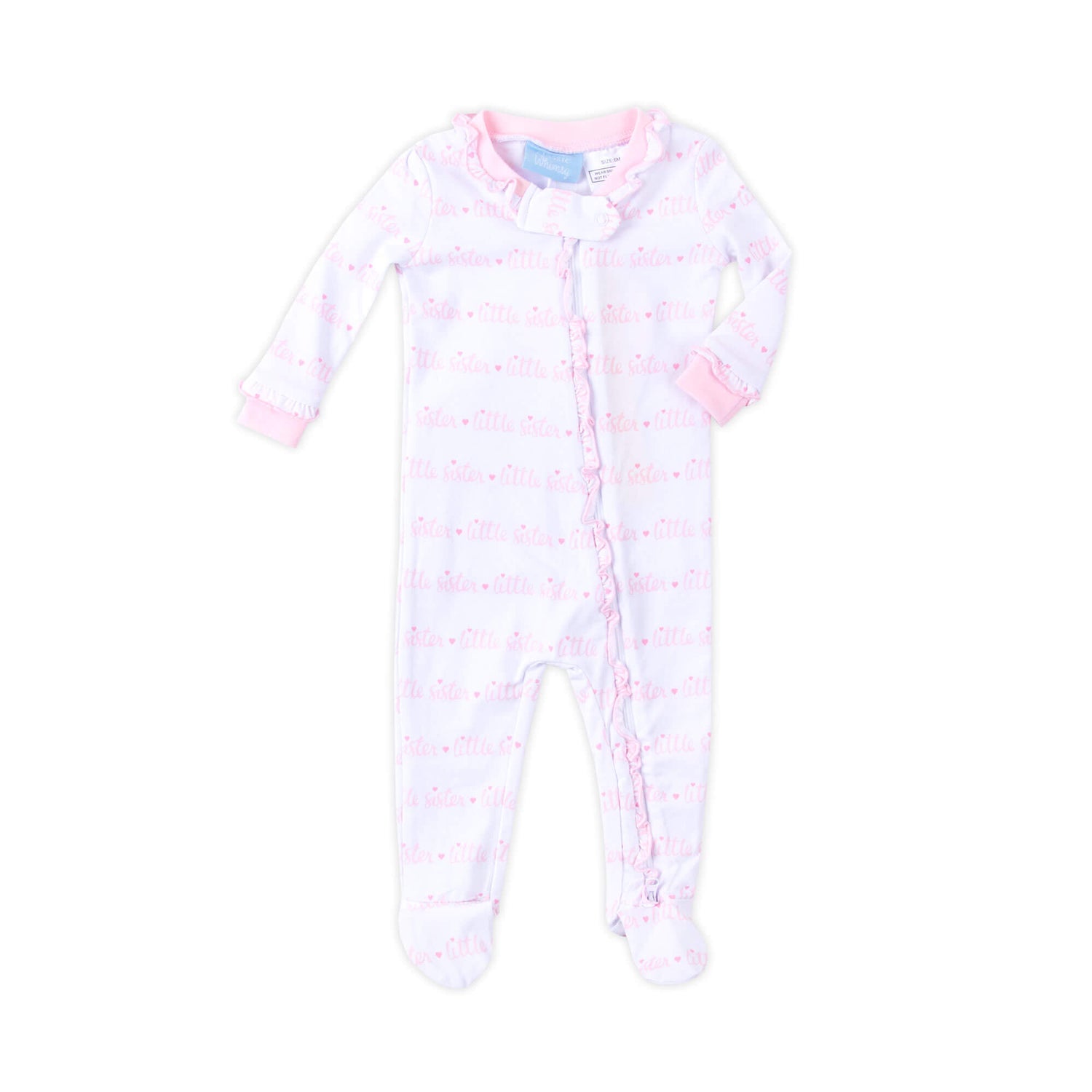 Get ready for bedtime fun with our Little Sister Zip Sleeper! This sweet onesie features an adorable pink "little sister" print with charming ruffle details. Designed for ultimate comfort and ease, it has a zip-up front and a sewn-down back flap. Available in footed only. Add a monogram for that extra special touch to make it even sweeter!