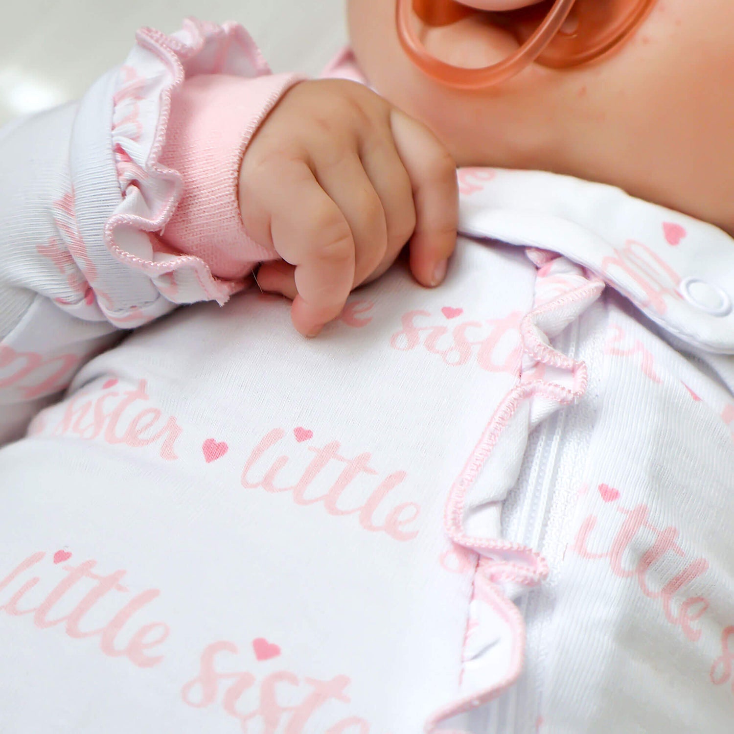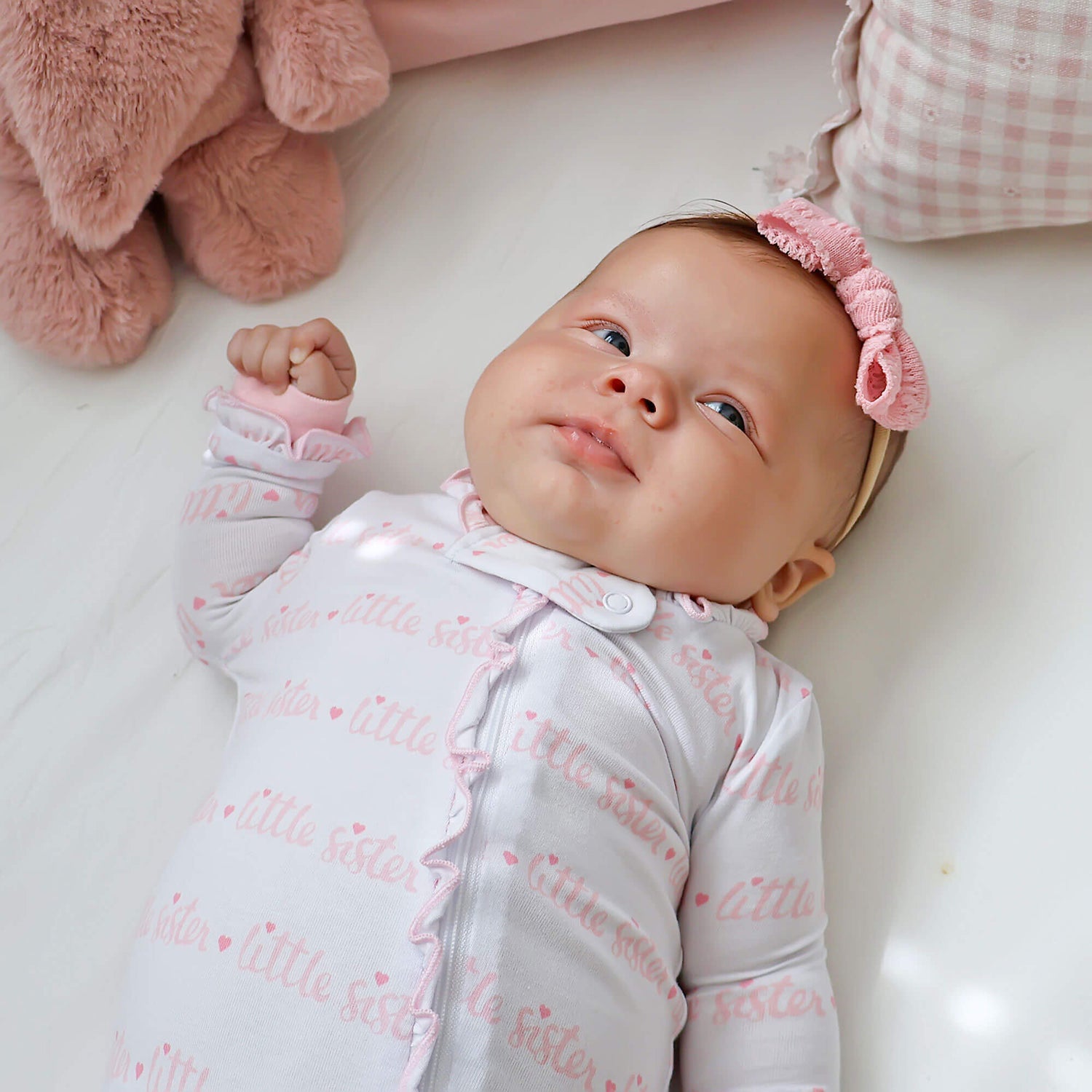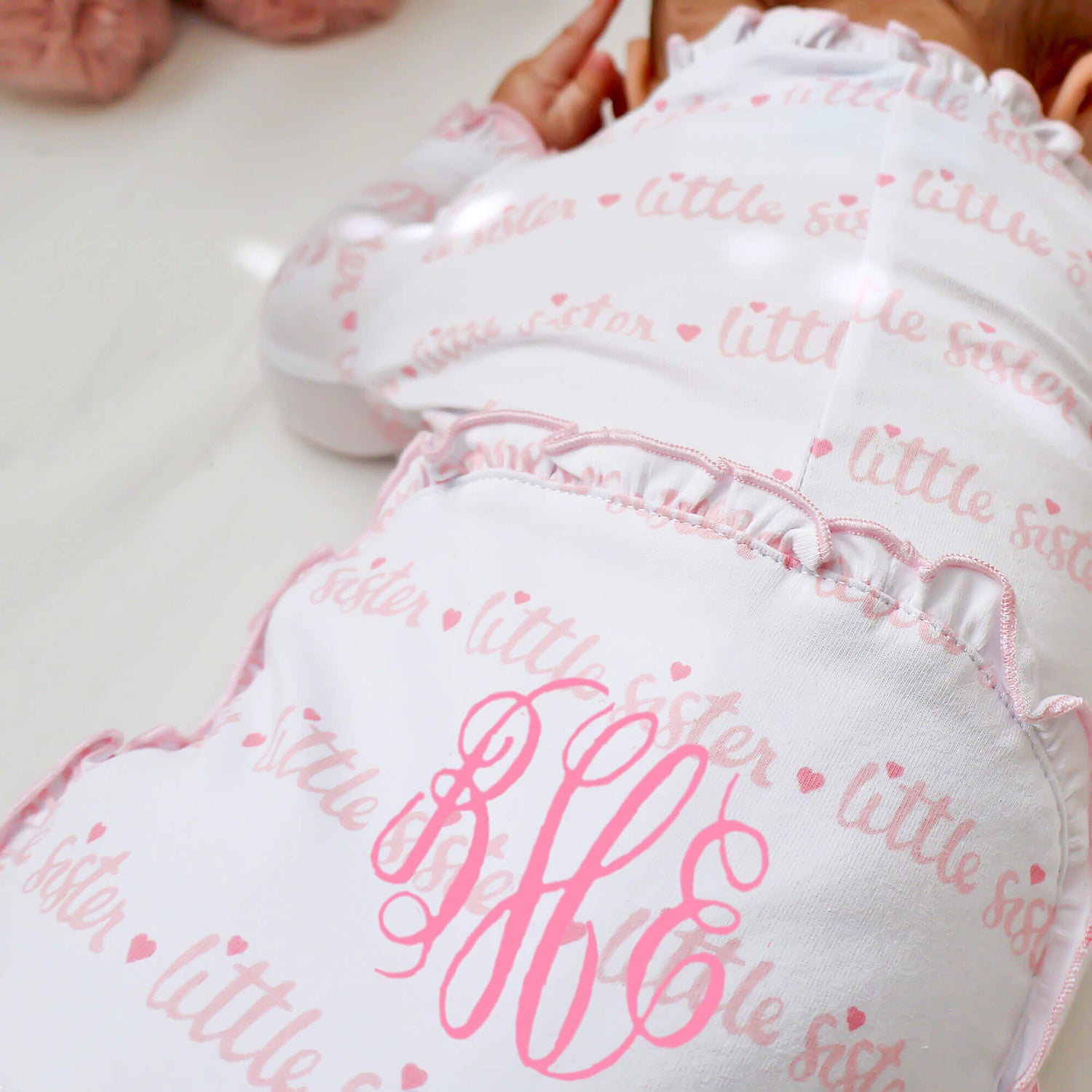 Get ready for bedtime fun with our Little Sister Zip Sleeper! This sweet onesie features an adorable pink "little sister" print with charming ruffle details. Designed for ultimate comfort and ease, it has a zip-up front and a sewn-down back flap. Available in footed only. Add a monogram for that extra special touch to make it even sweeter!