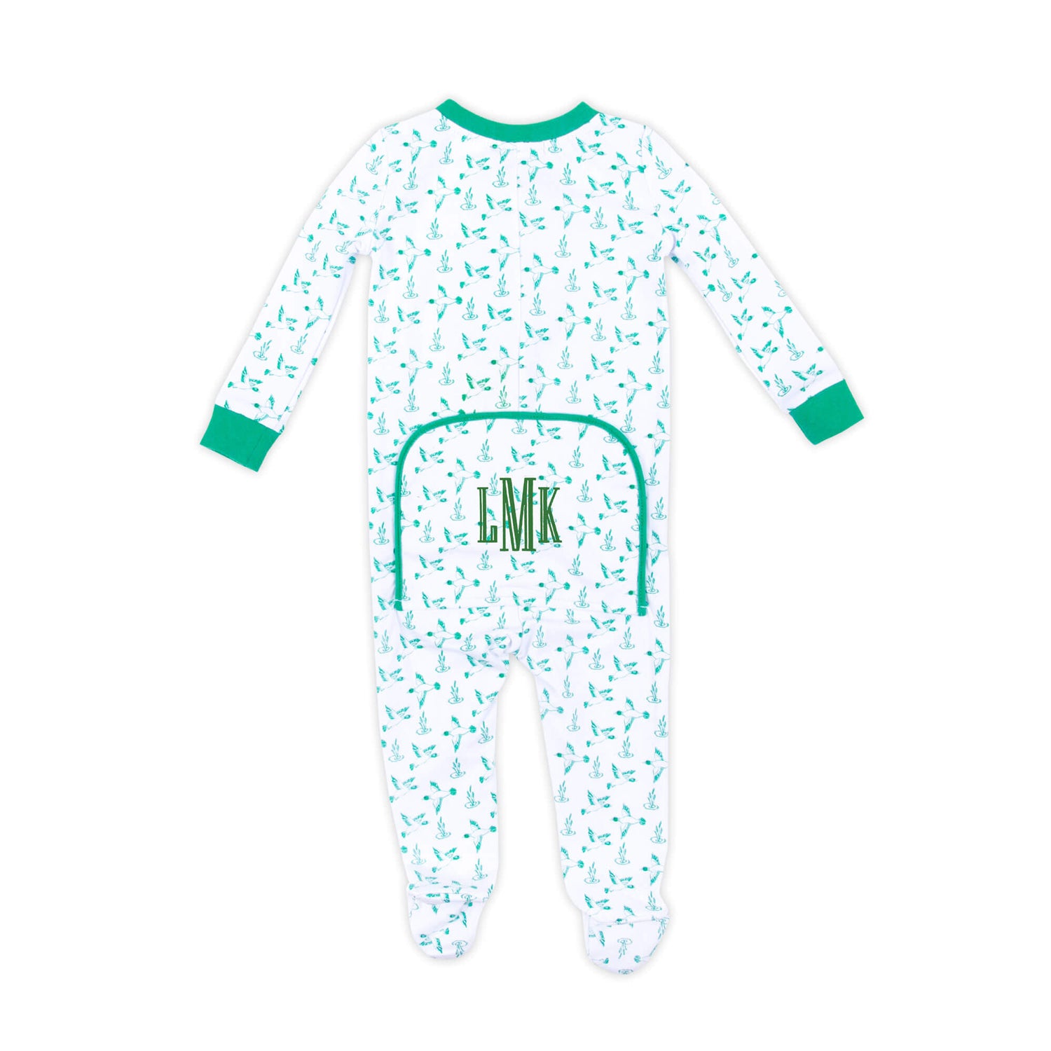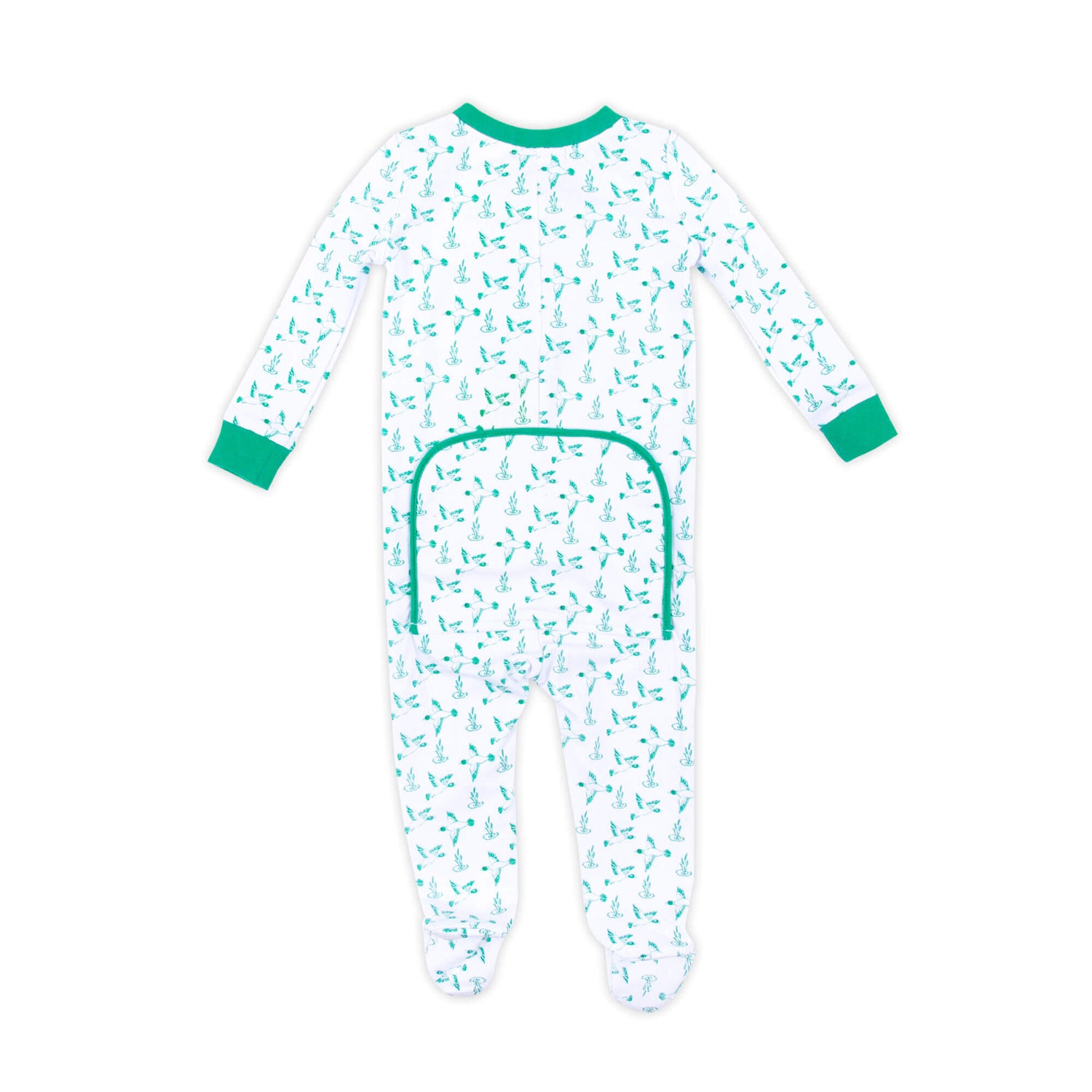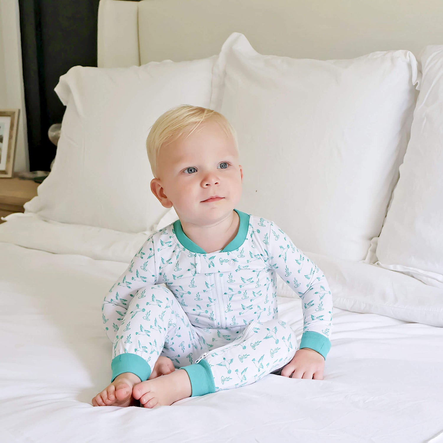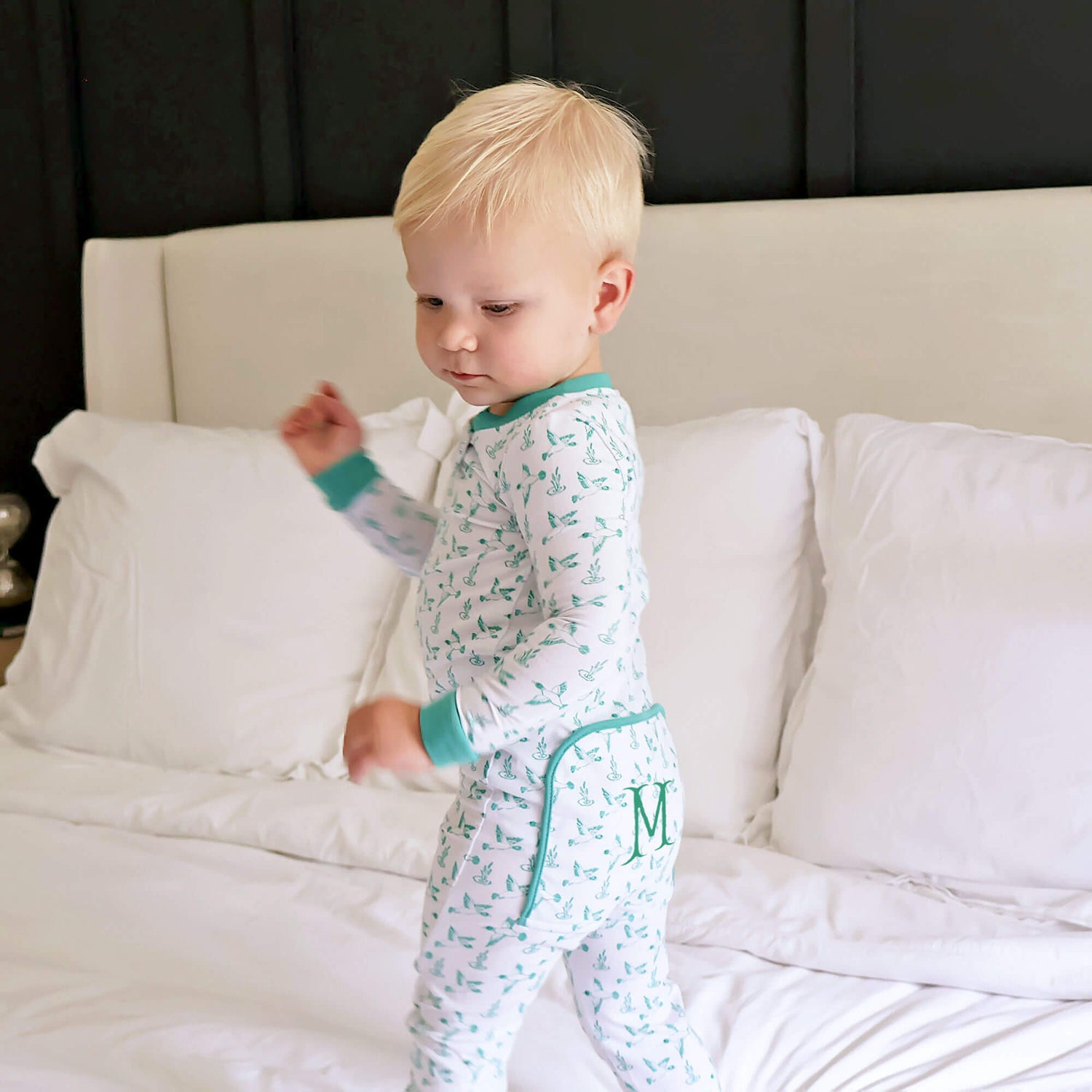 Your little duckling will love the Mallard Pond Zip Sleeper. Features the coolest mallard duck print with green ribbing. Perfect for all seasons! Easy 2 way zip-up front zipper! Back flap is sewn down. Selected sizes available footed & footless. Add a monogram to personalize your look! Makes the perfect baby gift!