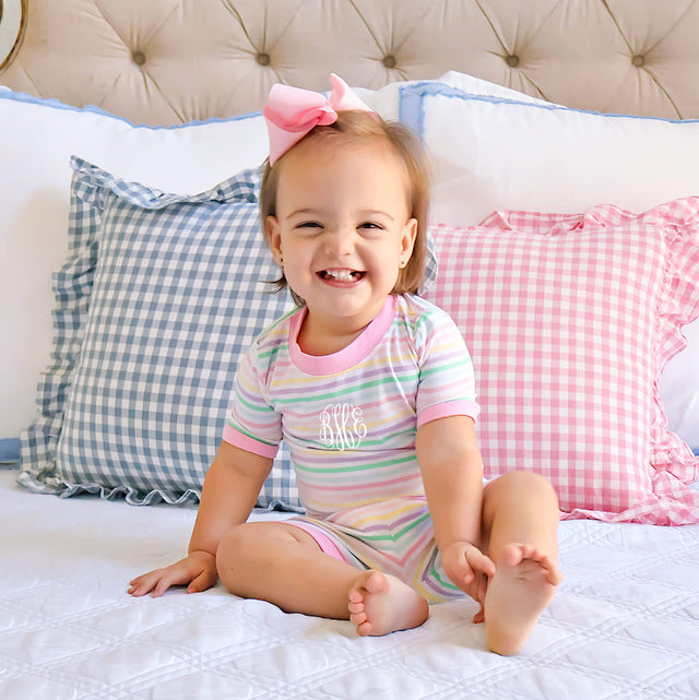 Your little one will be snug and comfortable in our Pastel Pink Stripe Short Pajamas. Featuring a charming multi-color stripe knit and white trim, this set includes a cozy short-sleeve pajama top and matching pull-on shorts, perfect for any season. Make these pajamas even more delightful by adding a monogram for a special touch!