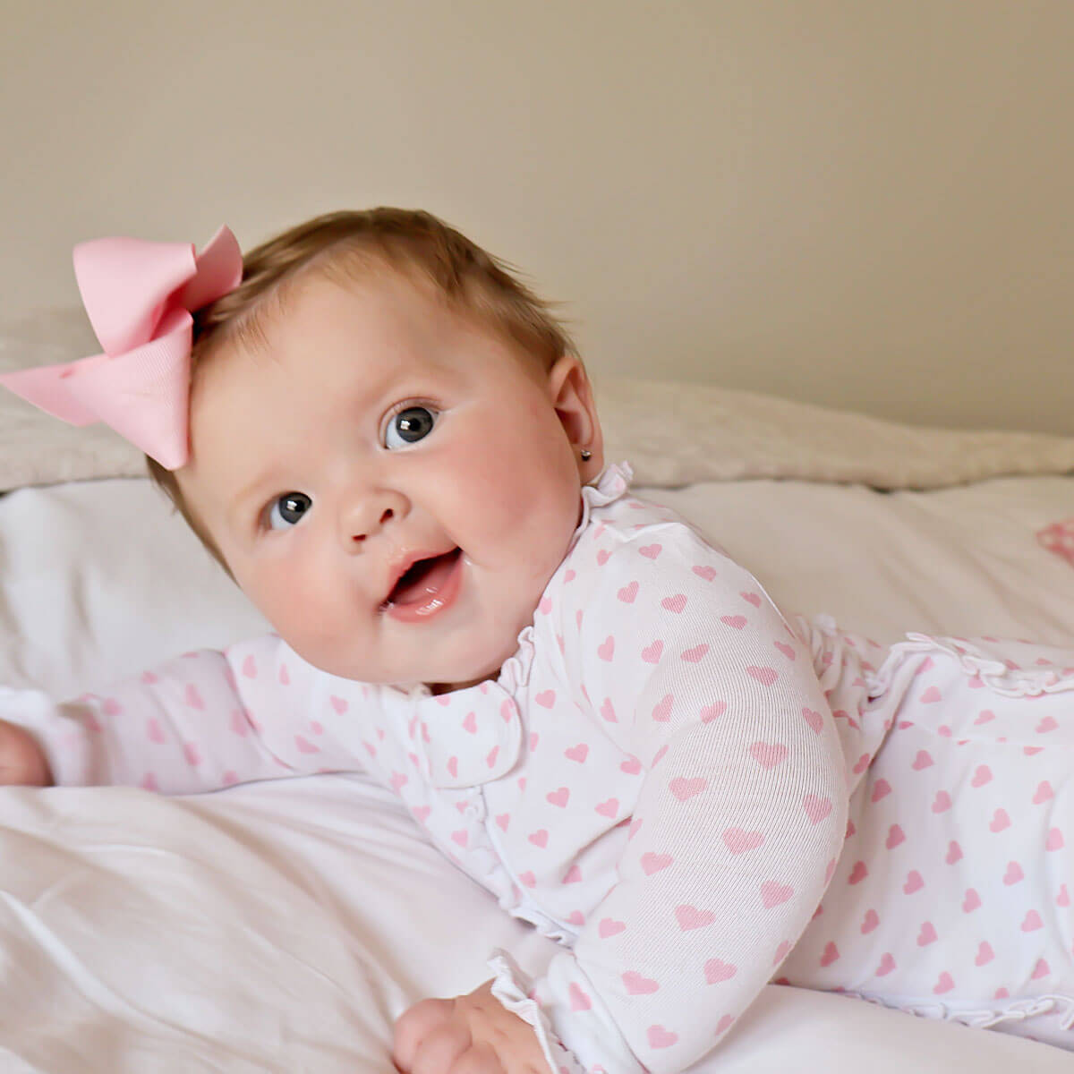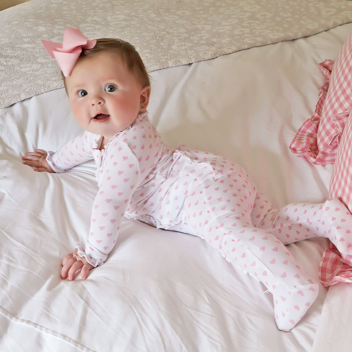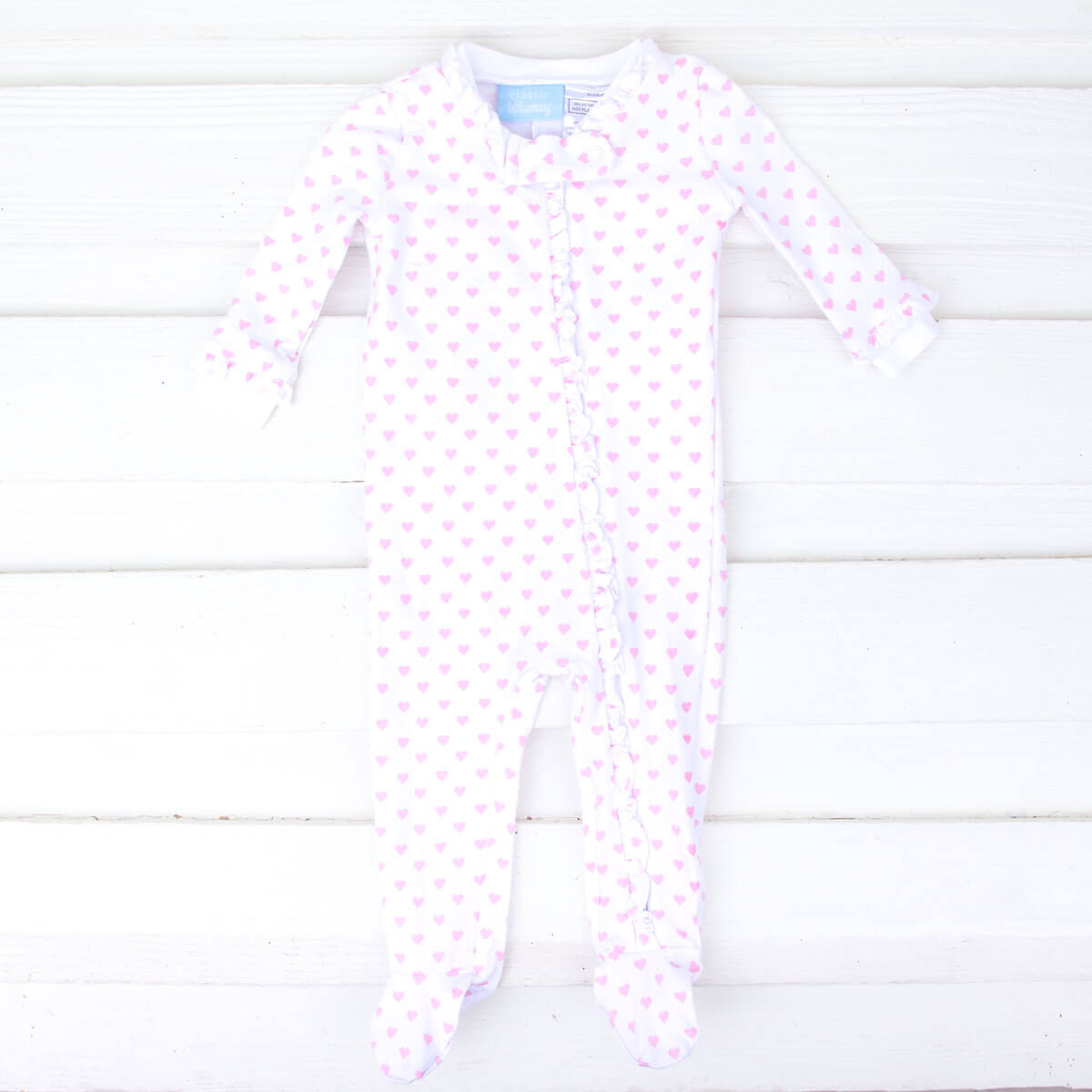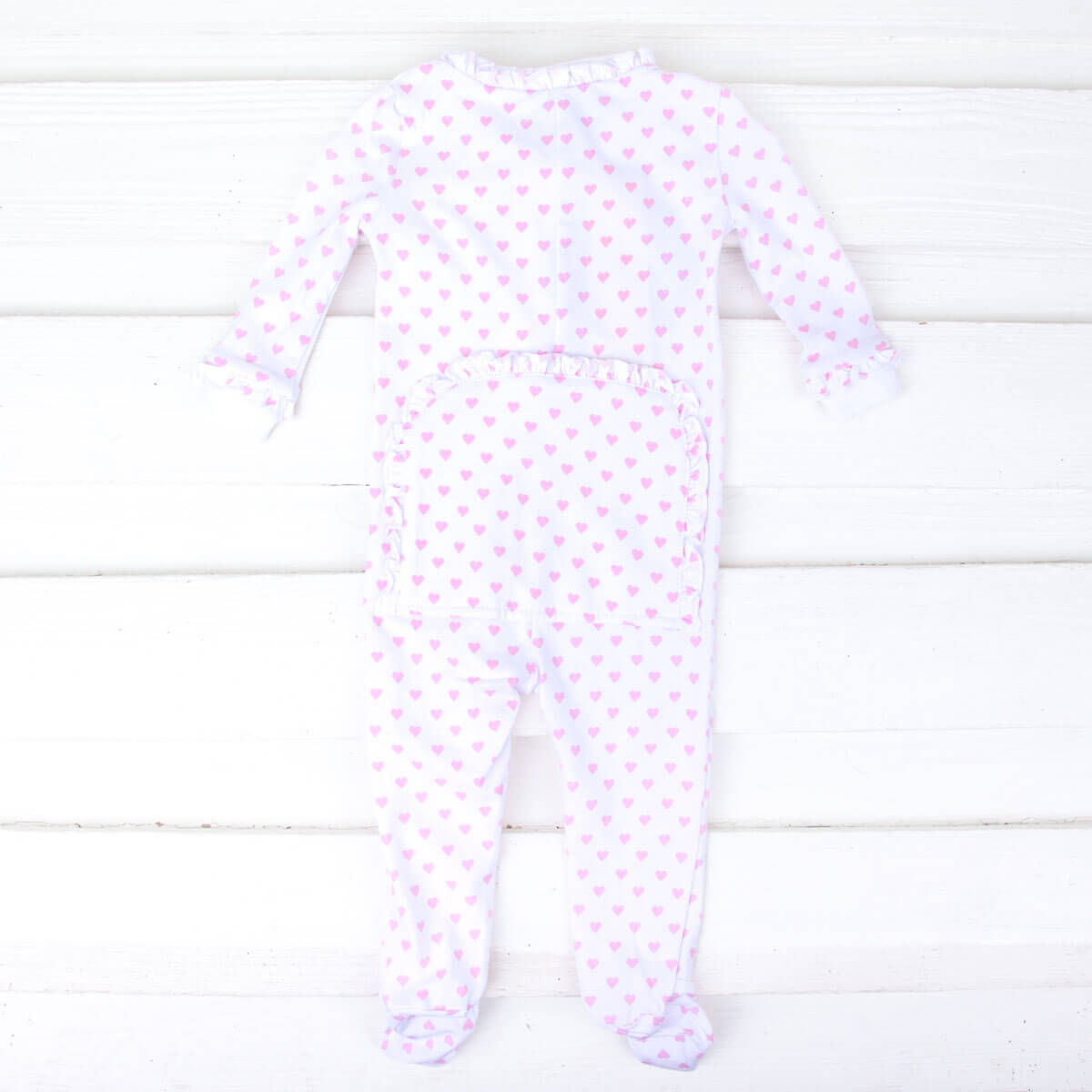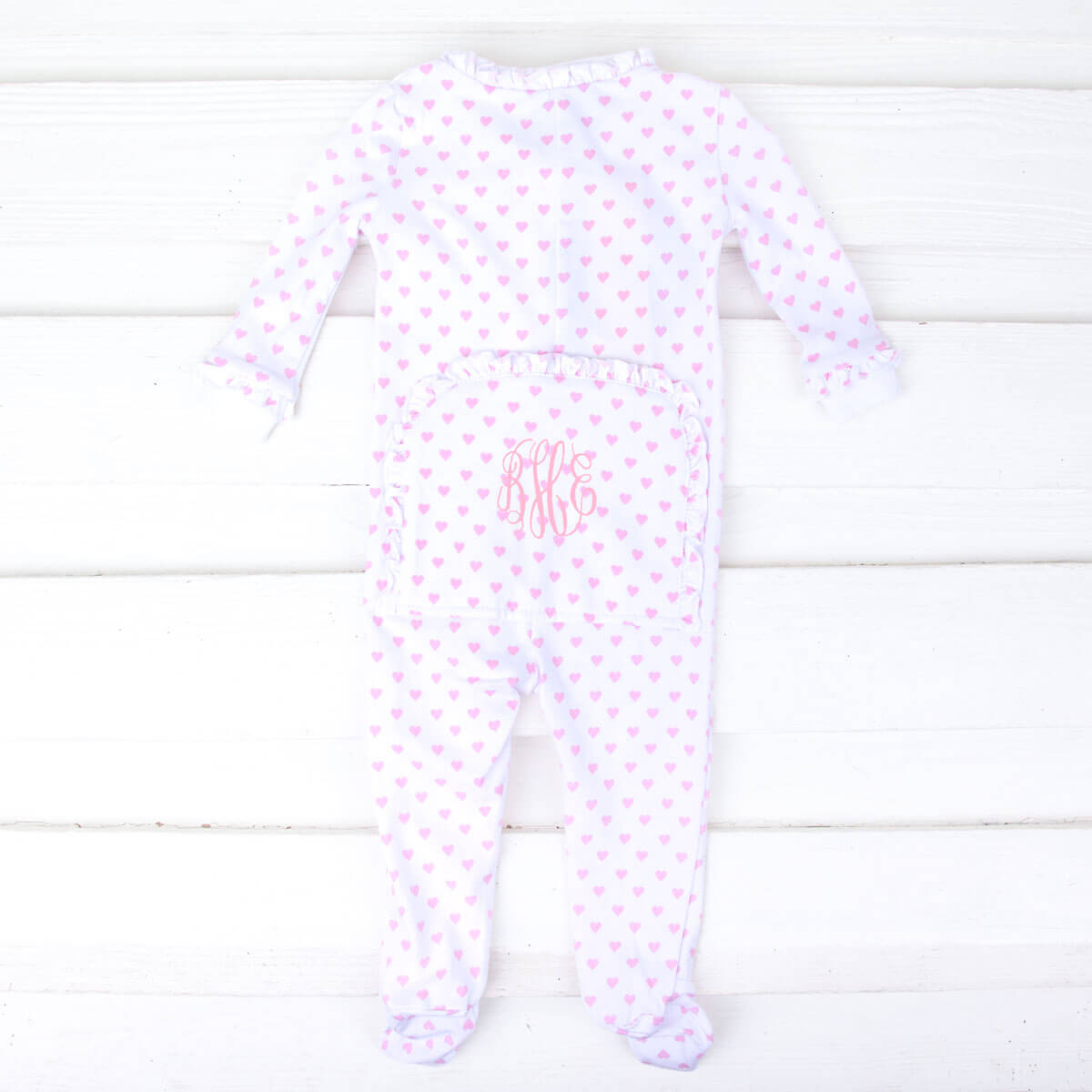 Get ready for bedtime in the sweet Pink Heart Print Zip Sleeper. This long-sleeve sleeper features a pink heart print with white ribbing. The easy zip-up front closure makes dressing your little one simple, while the footed design keeps their feet warm and cozy. Soft and snuggle-ready, this sleeper can be personalized with a monogram for an extra special touch.