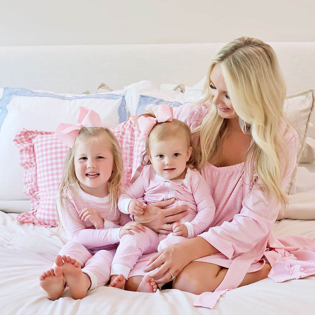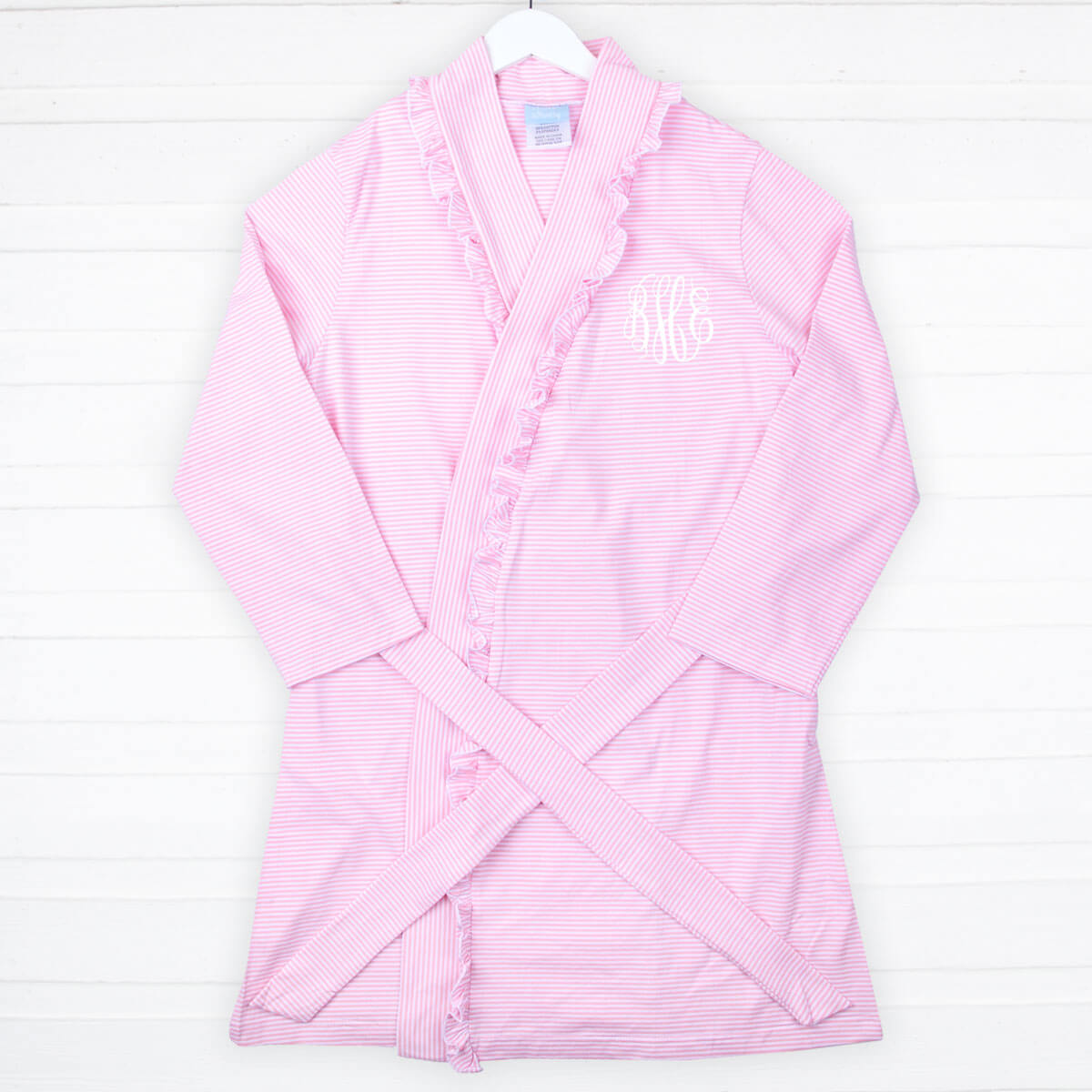 This darling Pink Stripe Women's Robe is a must-have for all moms, perfect for use all year round! Featuring playful ruffle details and an adjustable belt, this cozy robe offers everyday comfort that she'll adore. Made from a soft cotton blend, it's gentle on the skin and ideal for any season. Thoughtfully designed, it makes a heartwarming gift for new moms-to-be. Plus, you can coordinate with your little one's pajamas or baby sleeper for an extra sweet matching moment! Add a monogram to make this special robe even more personal and unique!