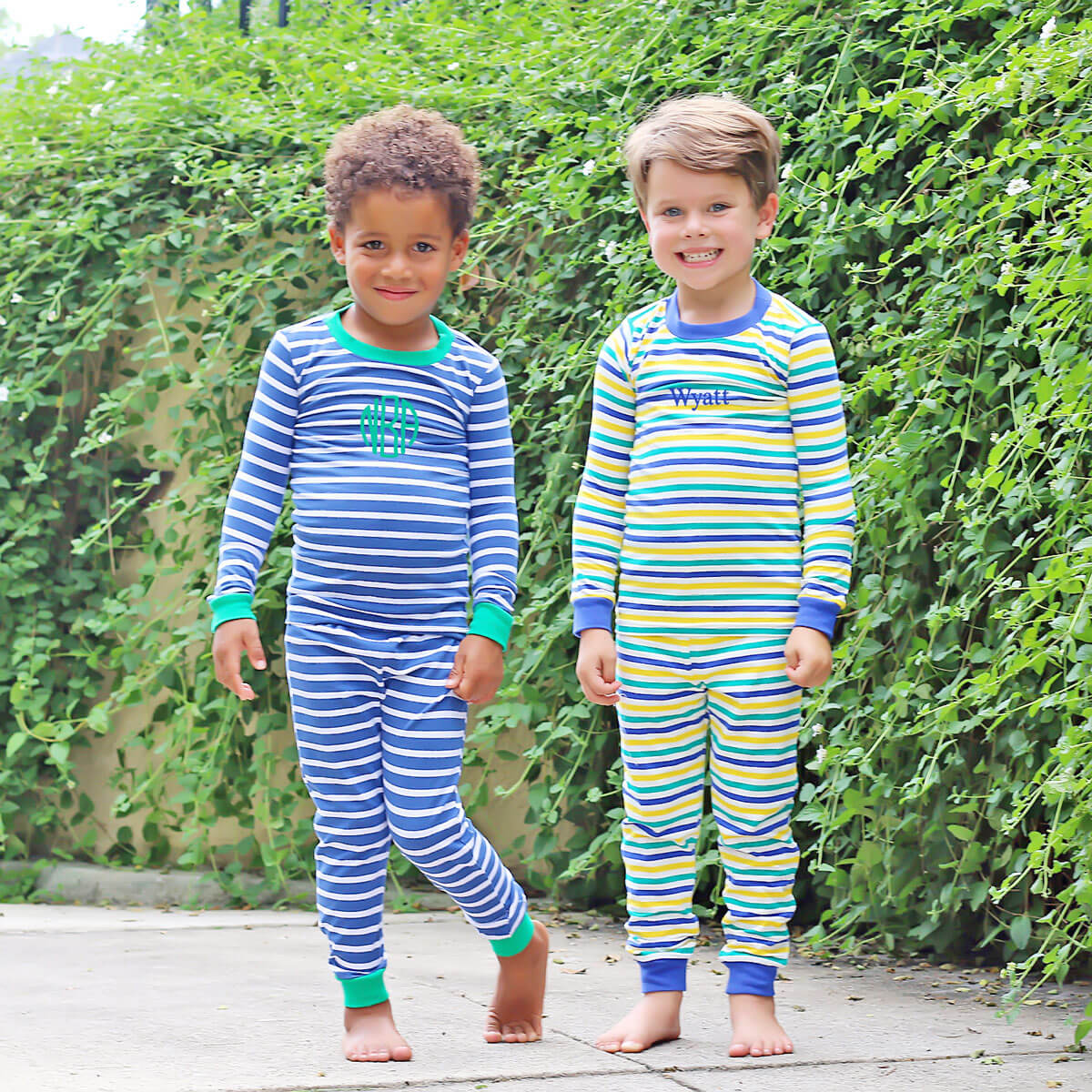 Your little one will be warm and comfortable sleeping in our Royal Blue and White Stripe Pajamas. Features a royal blue stripe print with green ribbing. Perfect for all seasons! Make these pajamas extra cute by adding a monogram!