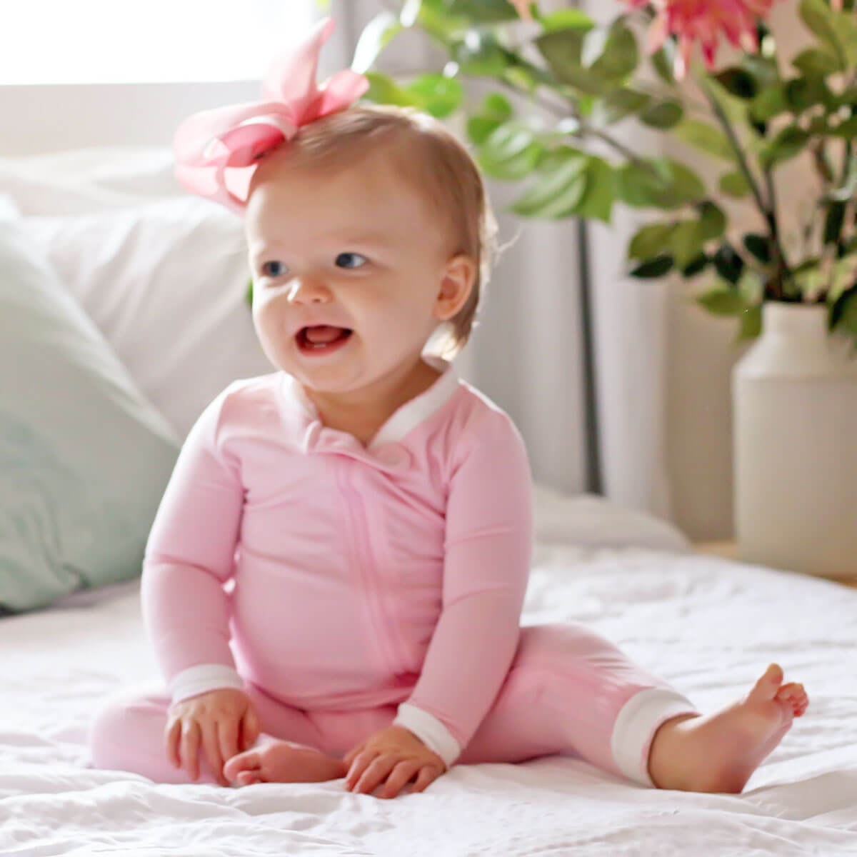 Your little one will be comfortable dreaming in this Solid Pink Zip Sleeper. The pink knit one piece pajama is the softest and most comfortable for your little one! Perfect for all seasons with an easy zip-up front zipper. Back flap is sewn down. Makes the perfect baby gift.