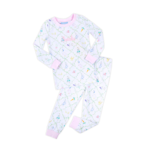 Get ready for the sweetest Easter dreams with our Storybook Rabbit Pink Pajamas! This adorable set features a long-sleeve pajama top with a charming bunny book characters print, soft pink ribbing trim, and matching pull-on pajama pants. Perfect for celebrating the season, these pajamas bring extra joy to Easter morning, bedtime snuggles, and story time traditions. Add a monogram for a personalized touch that makes this set even more special!