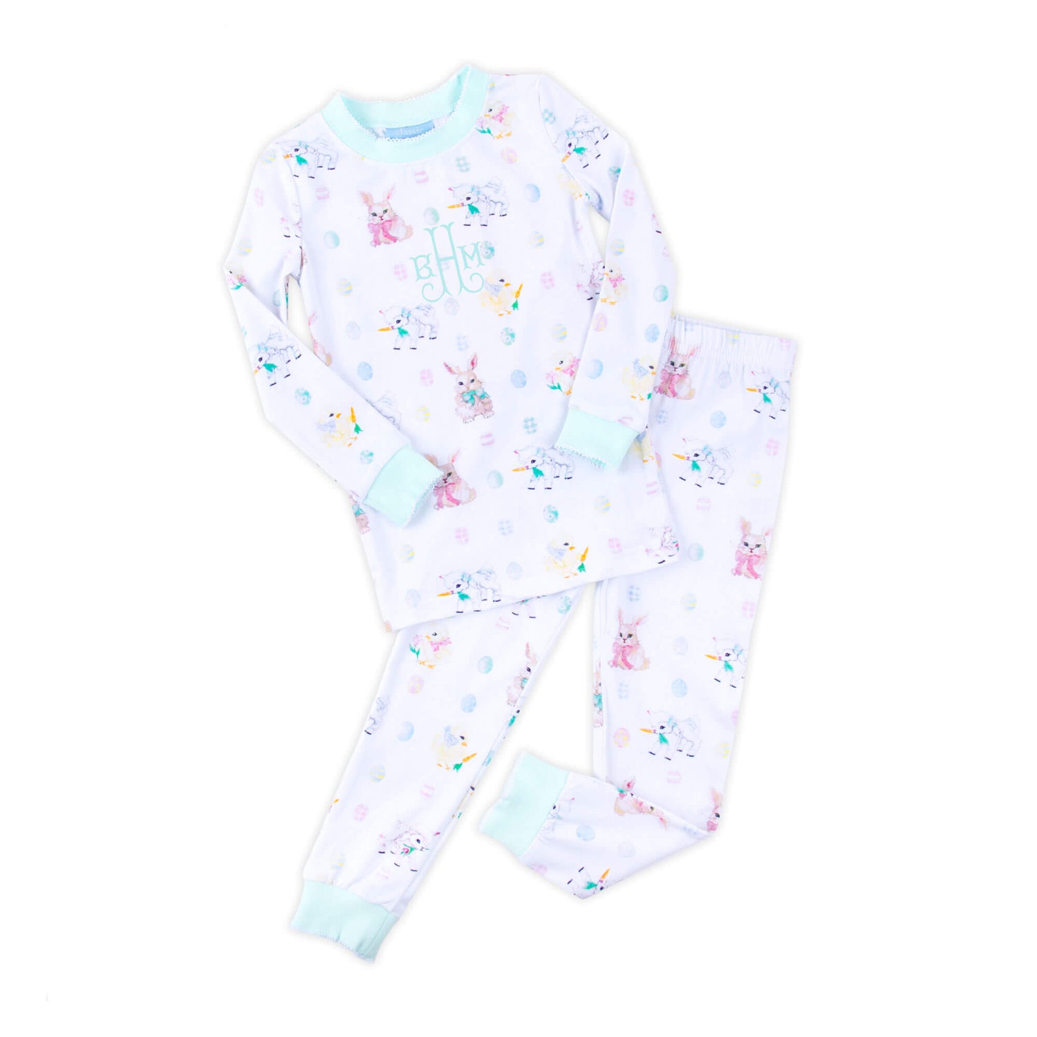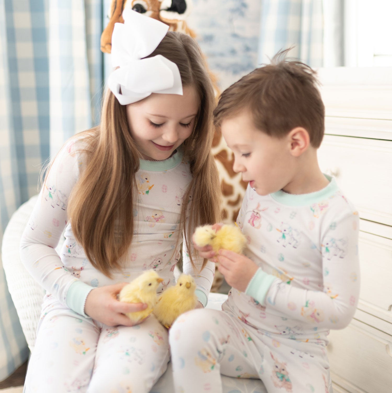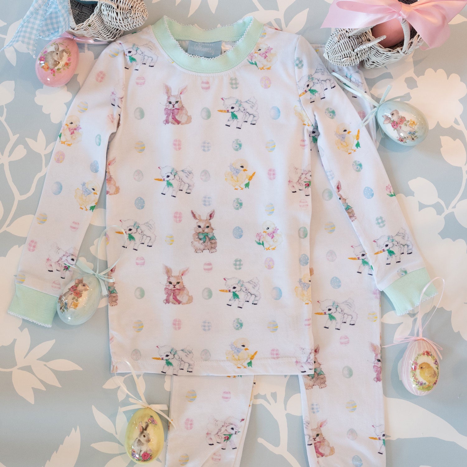Hop into bedtime fun with our exclusive The Broke Brooke x Classic Whimsy Easter Pajamas! This adorable set features the sweetest Easter print, filled with colorful eggs, playful bunnies, fluffy lambs, and cheerful ducklings. Designed for cozy spring nights, the long-sleeve pajama top and matching pull-on pajama pants are finished with soft light blue ribbing. Add a monogram for an extra special touch that makes Easter memories even sweeter!