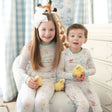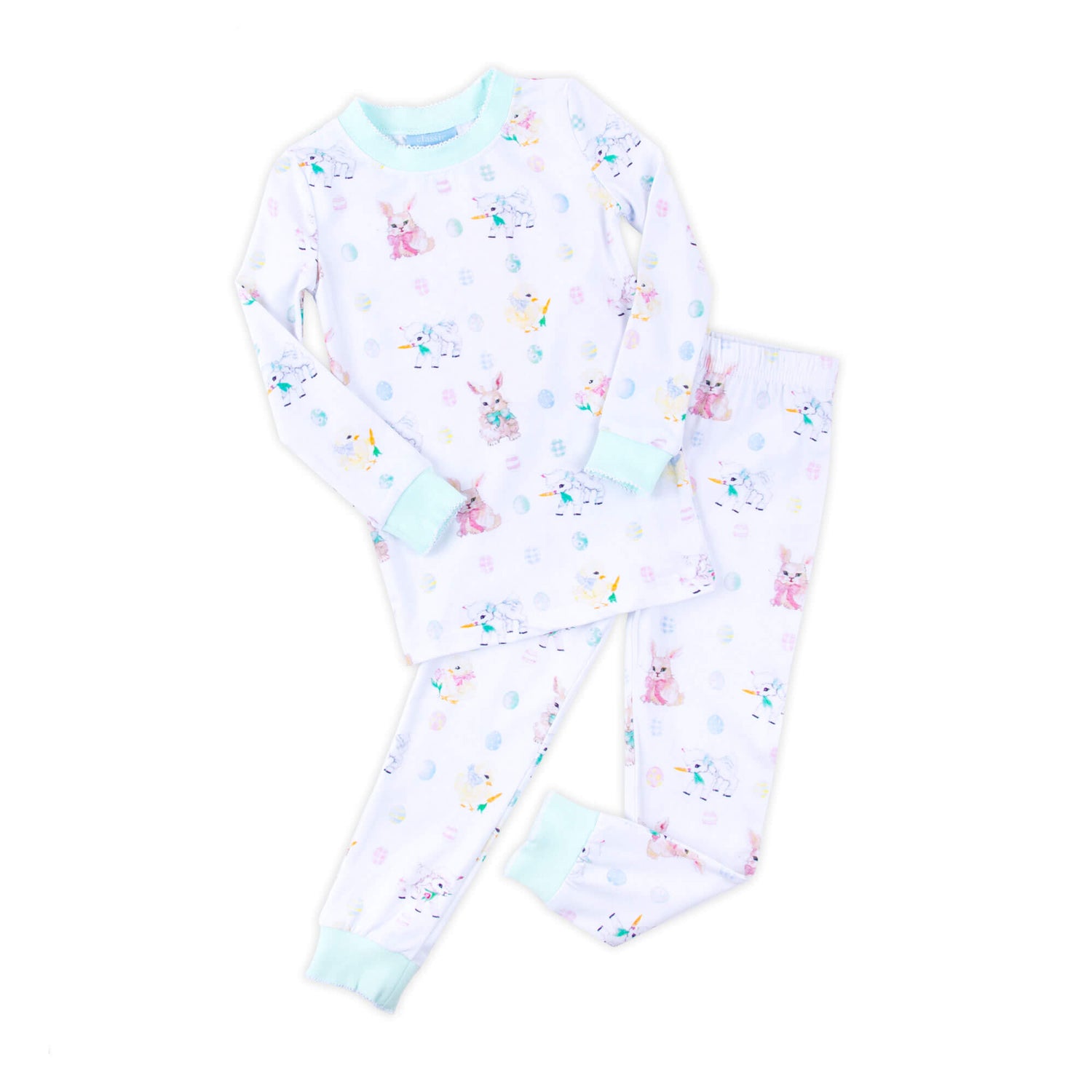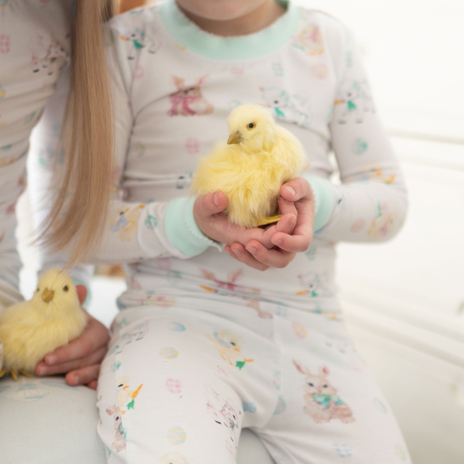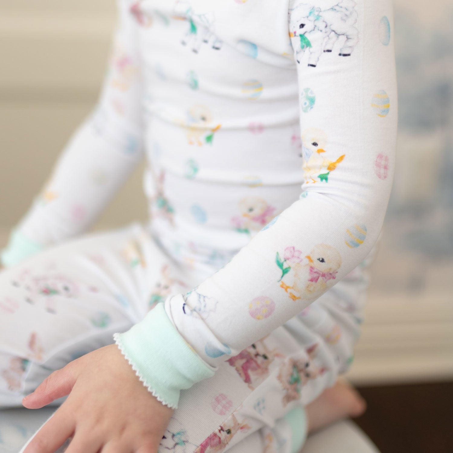 Hop into bedtime fun with our exclusive The Broke Brooke x Classic Whimsy Easter Pajamas! This adorable set features the sweetest Easter print, filled with colorful eggs, playful bunnies, fluffy lambs, and cheerful ducklings. Designed for cozy spring nights, the long-sleeve pajama top and matching pull-on pajama pants are finished with soft light blue ribbing. Add a monogram for an extra special touch that makes Easter memories even sweeter!