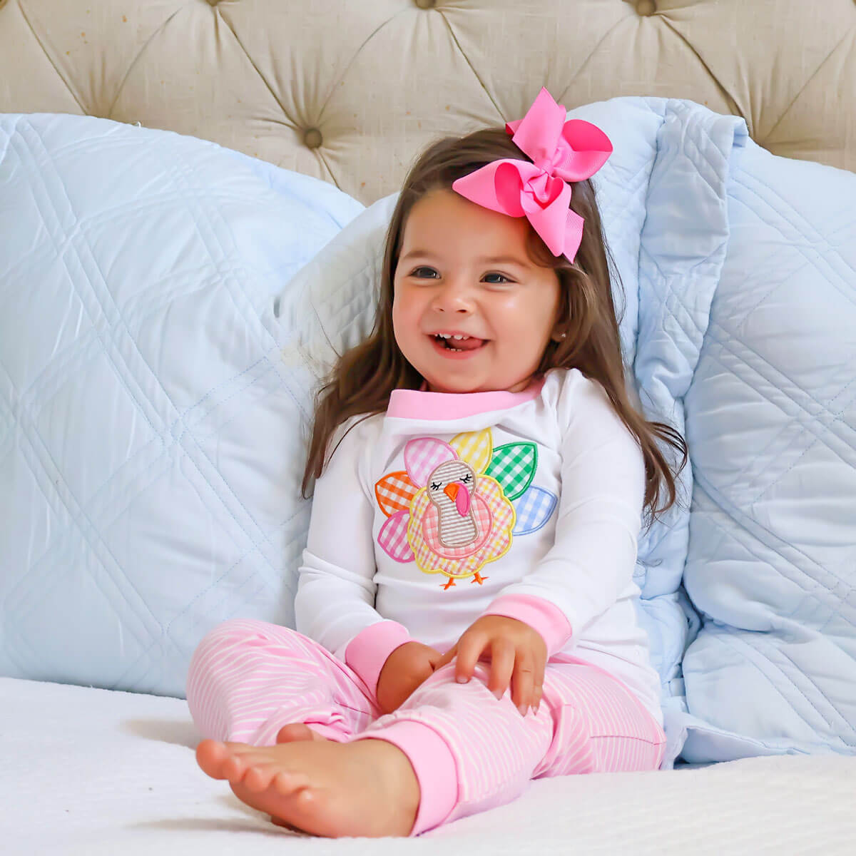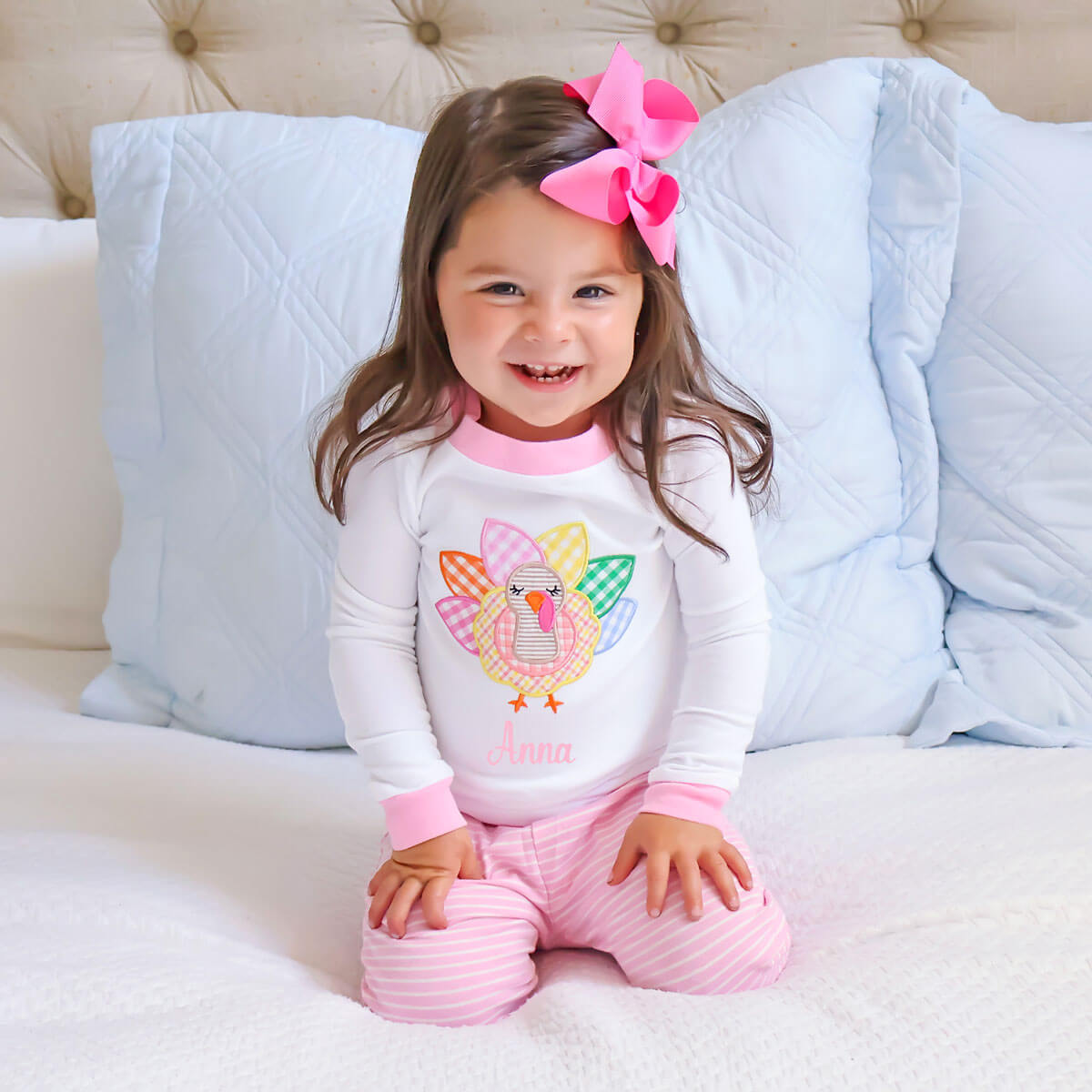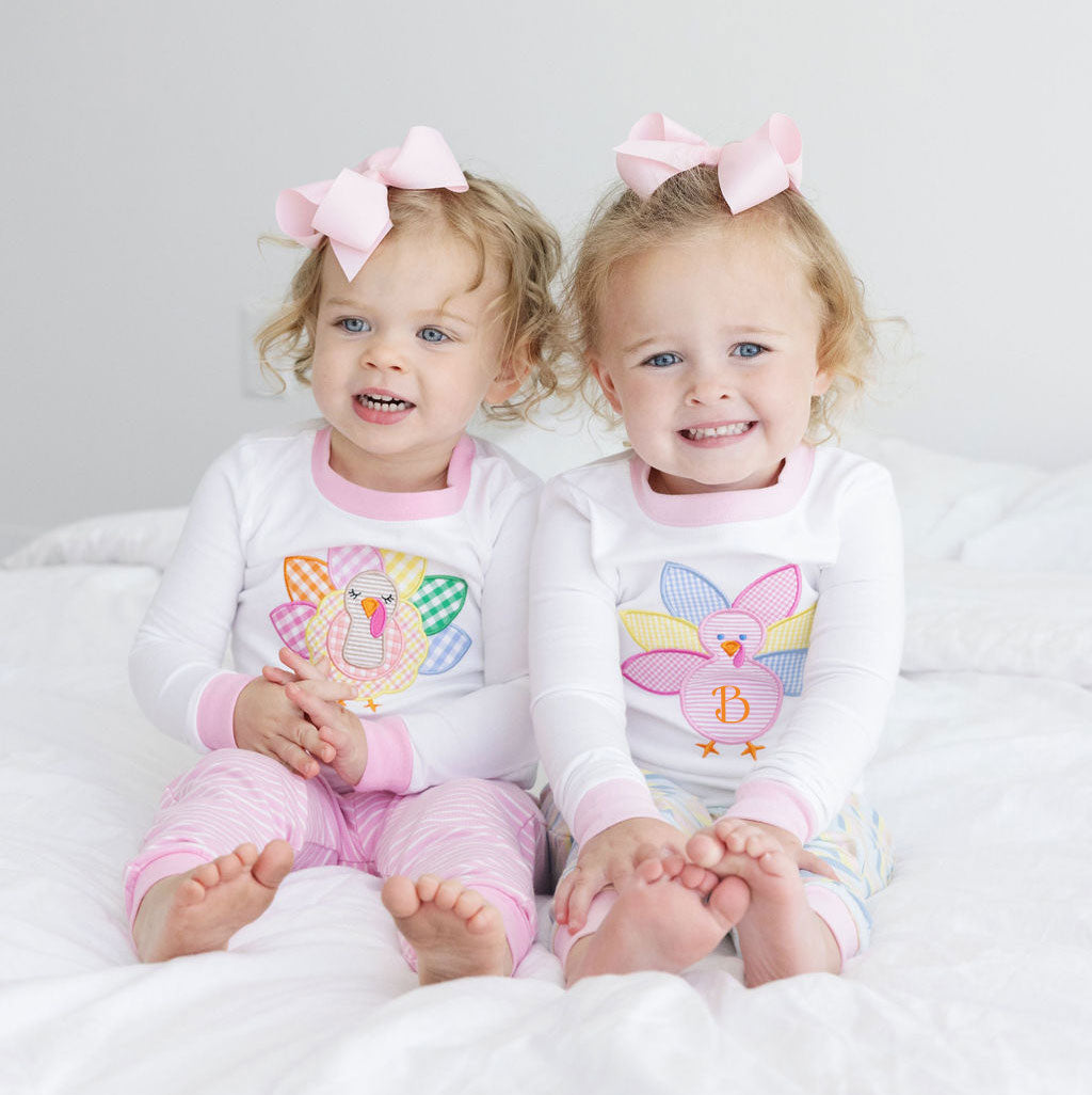 Your little one will be cozy and festive in our Turkey Pink Stripe Pajamas. The white long-sleeve pajama top features a cute turkey applique, and the set is coordinated with pink stripe pajama bottoms. Personalize these pajamas with a monogram for an adorable touch! Whether it's for a good night's sleep, lounging, or simply enjoying a comfortable bedtime routine, your little one will adore these pajamas.