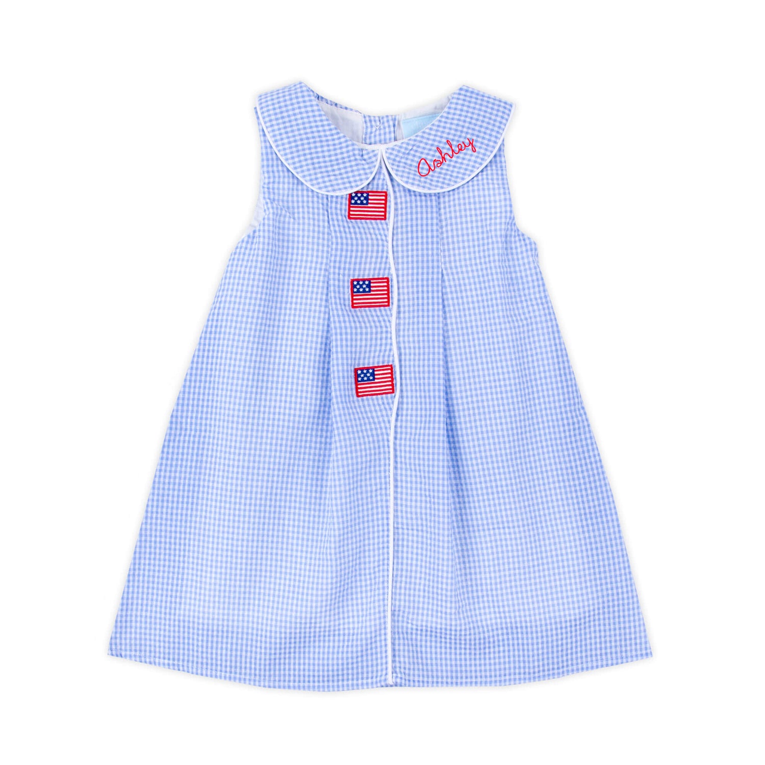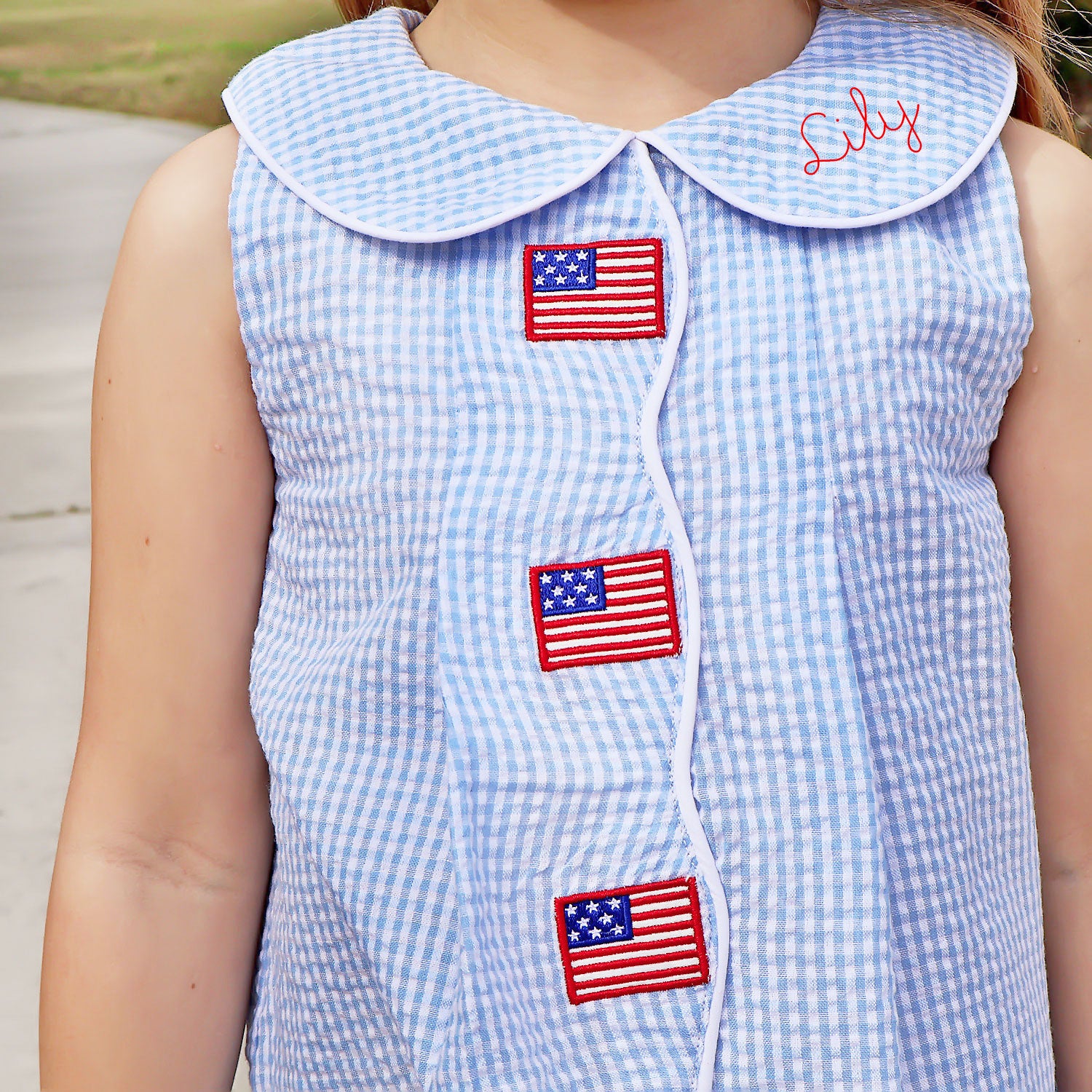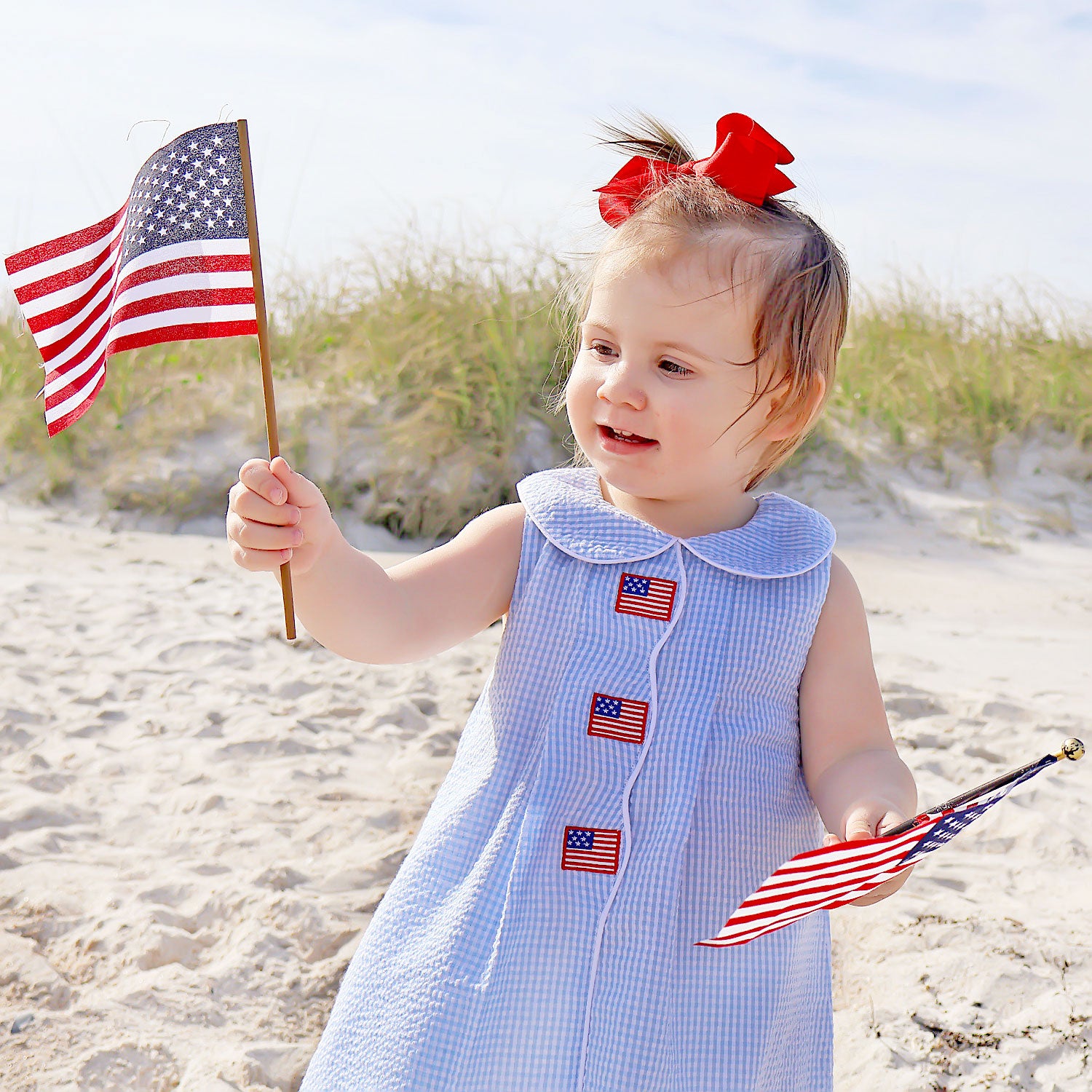 This Flag Light Blue Gingham Jane Dress is perfect for celebrating the 4th of July and enjoying fireworks. The sleeveless Jane-style dress in light blue gingham is adorned with embroider flags, a lovely collar, and pleated details. Elevate its patriotic charm by adding a personalized monogram.