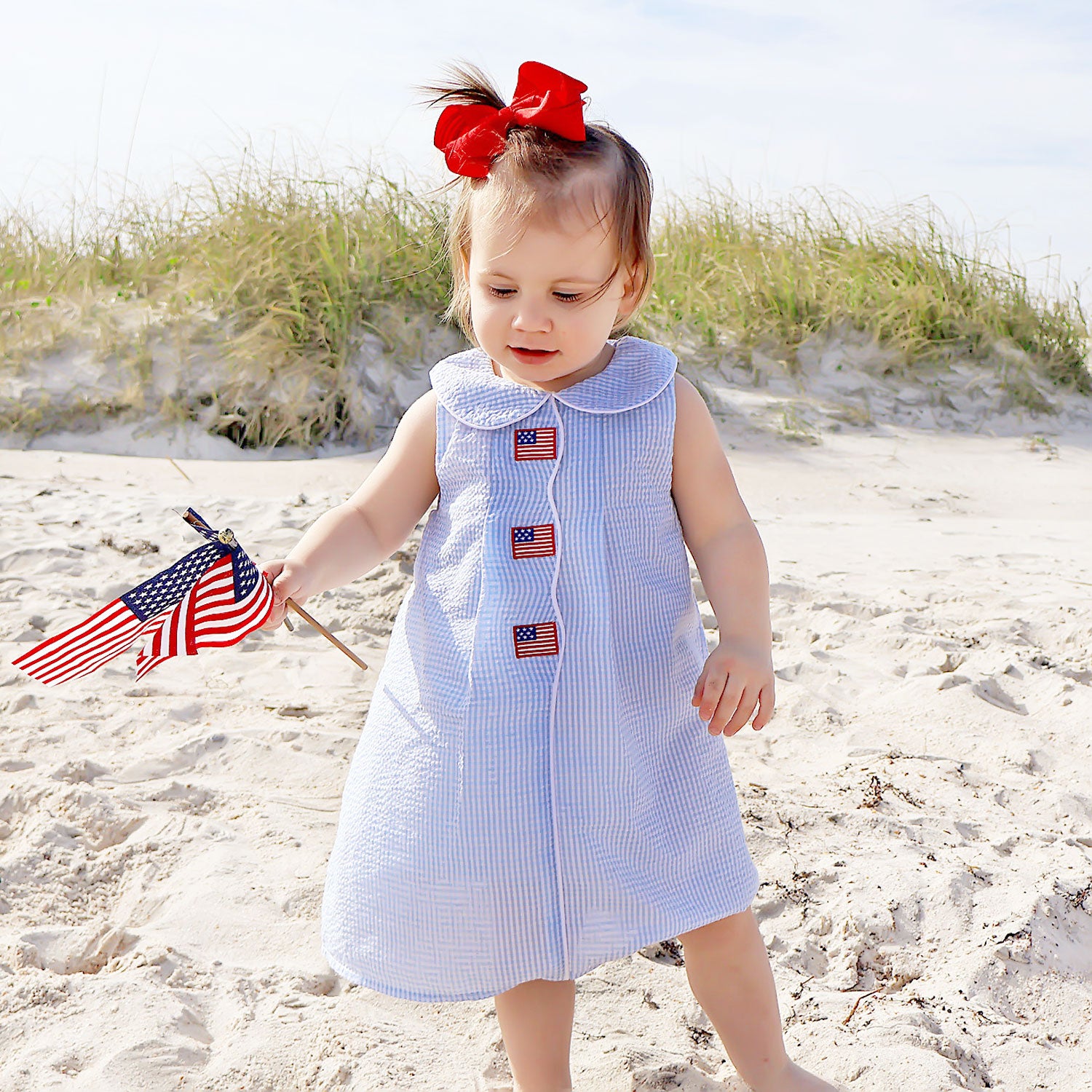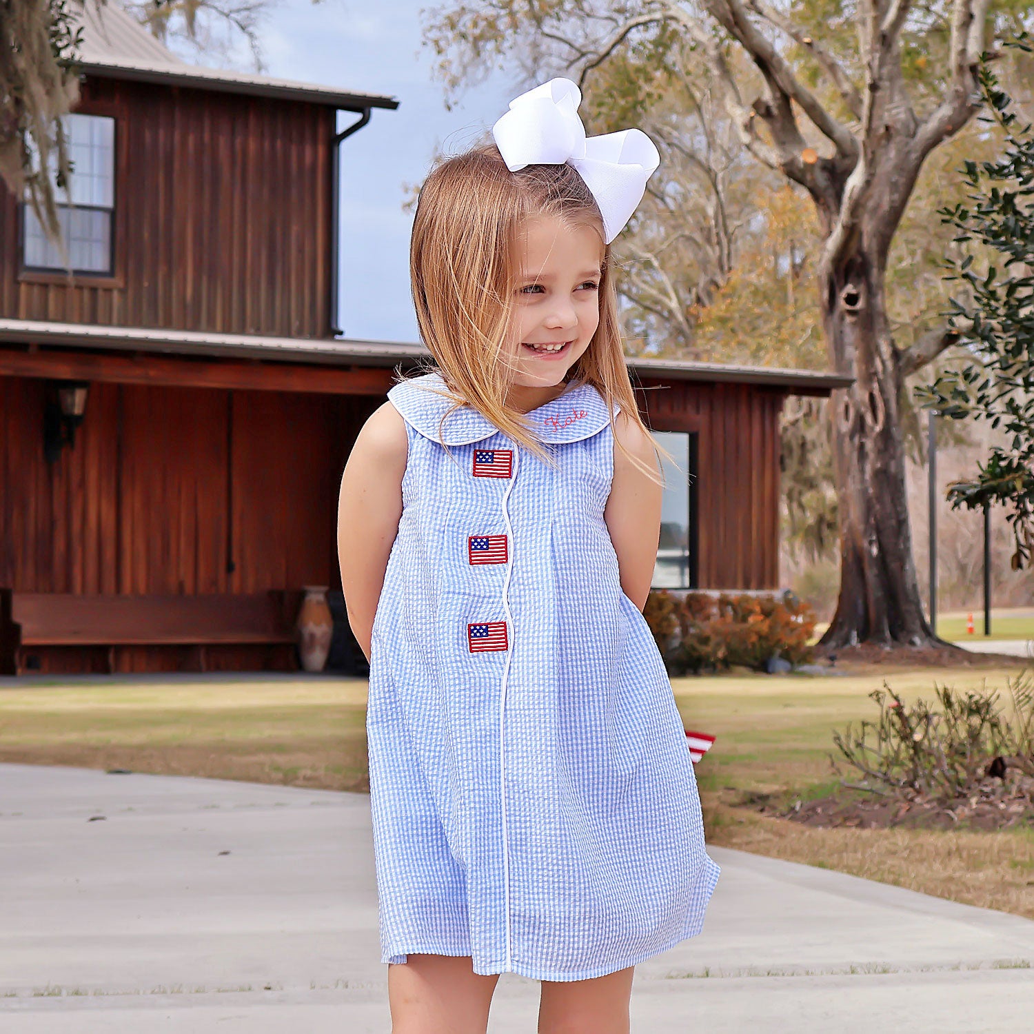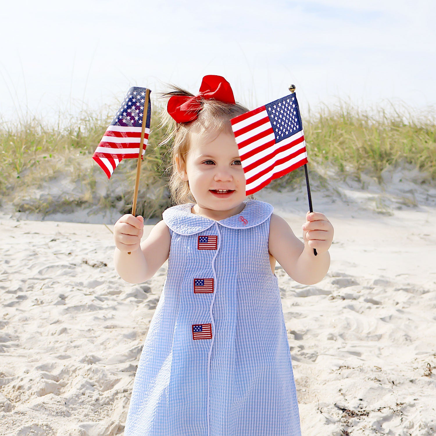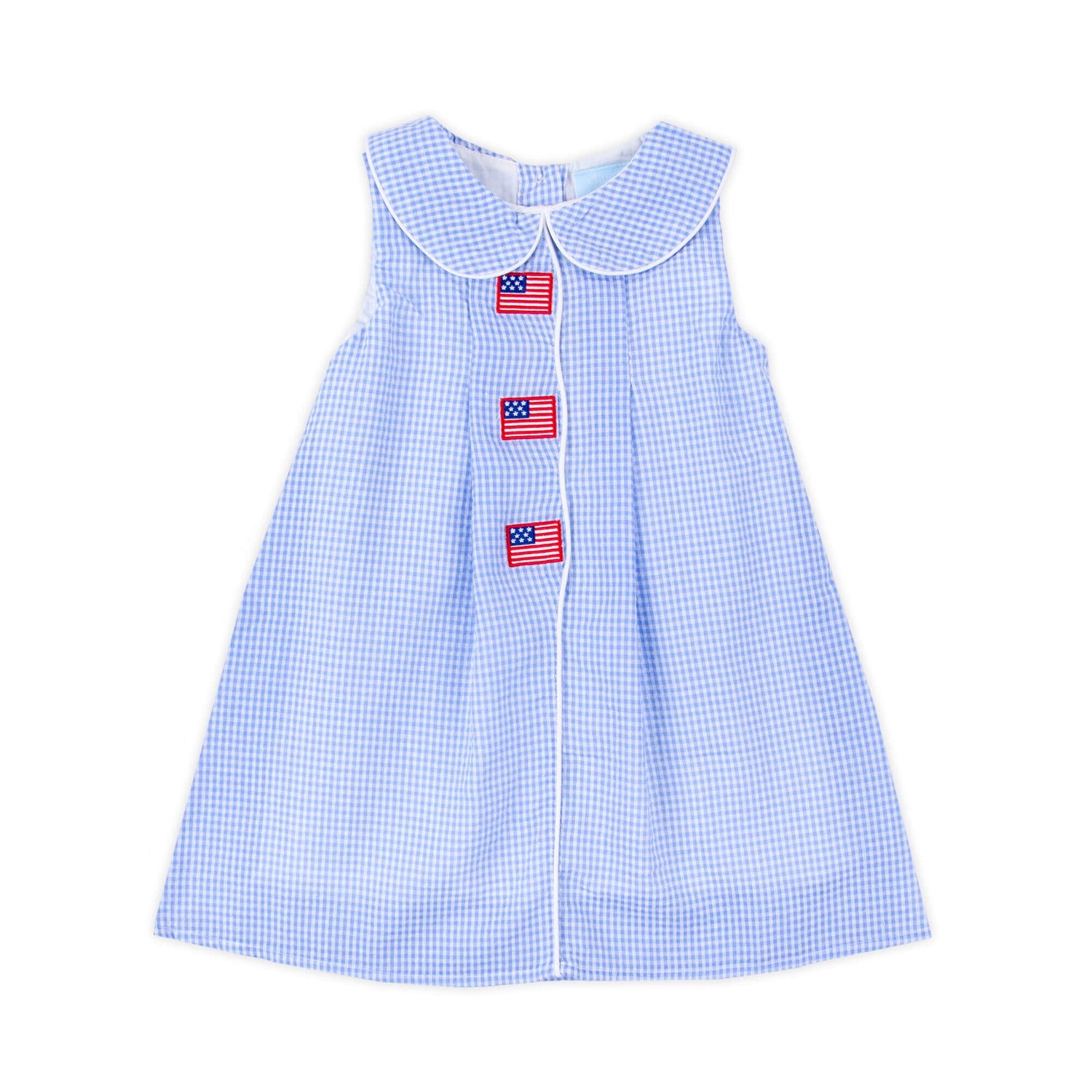 This Flag Light Blue Gingham Jane Dress is perfect for celebrating the 4th of July and enjoying fireworks. The sleeveless Jane-style dress in light blue gingham is adorned with embroider flags, a lovely collar, and pleated details. Elevate its patriotic charm by adding a personalized monogram.