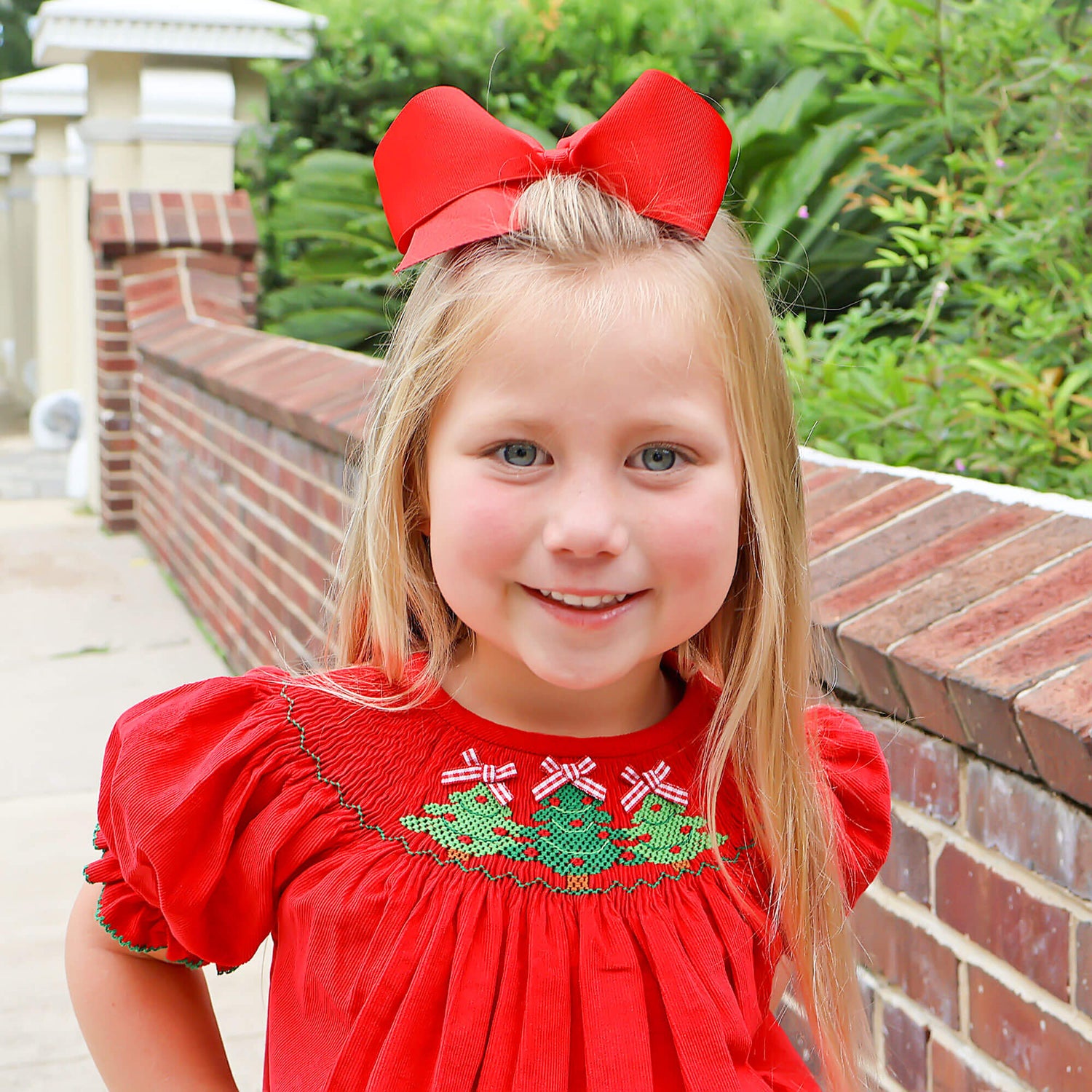 Get ready to deck the halls in style with our Christmas Tree Smocked Red Corduroy Dress! This charming dress features hand-smocked Christmas trees topped with sweet bows, along with adorable bishop sleeves trimmed in green for an extra festive touch.
