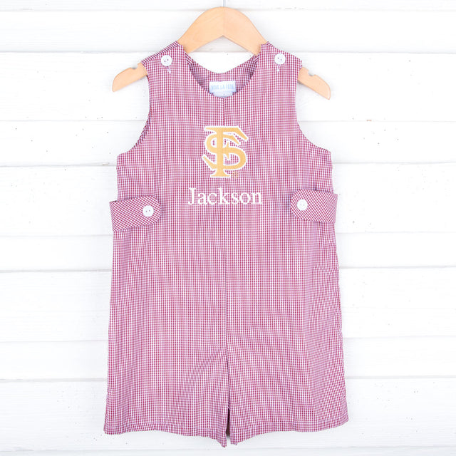 Go Noles! Dress your little one in style this football season with our FSU Embroidered Maroon Jon Jon. This charming gingham outfit proudly features the FSU embroidered logo and includes side tabs for added detail. With convenient snaps in stride and back buttons for closure, it's as practical as it is cute! Personalize it with a name monogram for that extra special touch!