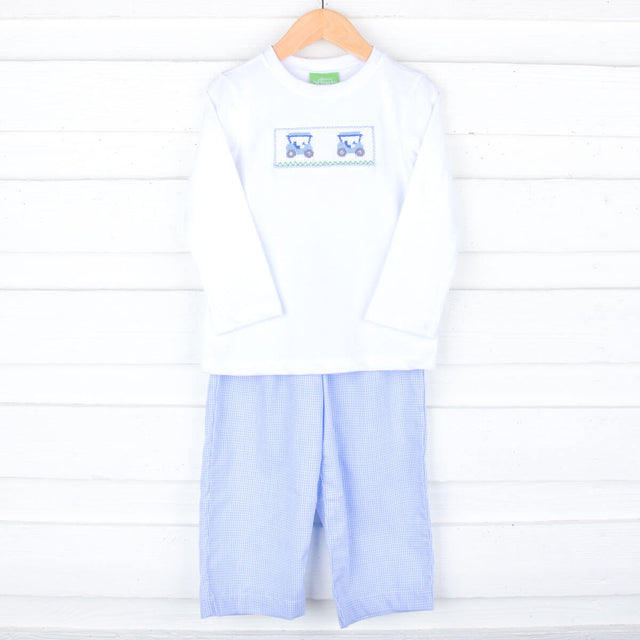 Hit the course in style with our Golf Cart Smocked Blue Gingham Pant Set! Perfect for game days, this playful white knit shirt features adorable smocked golf carts, adding a fun touch to any outing. Coordinated with blue gingham waistband pants, this set ensures your little one is ready for all the summer adventures ahead!