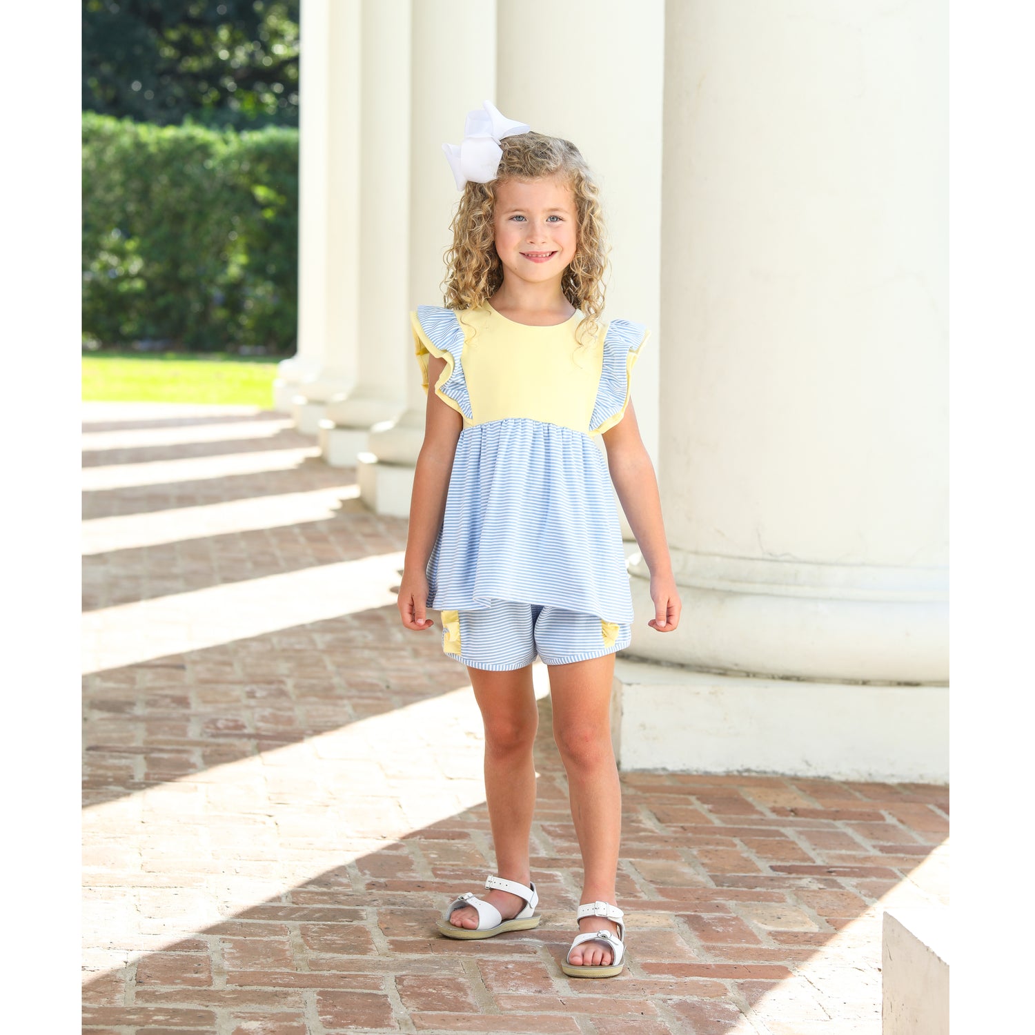 The Rosie Cornflower and Yellow Short Set is perfect for any occasion! The cornflower and yellow knit top features a playful waterfall ruffle detail, paired with coordinating cornflower shorts for a sweet look that's ready for playtime fun. Add a monogram to personalize this adorable outfit!