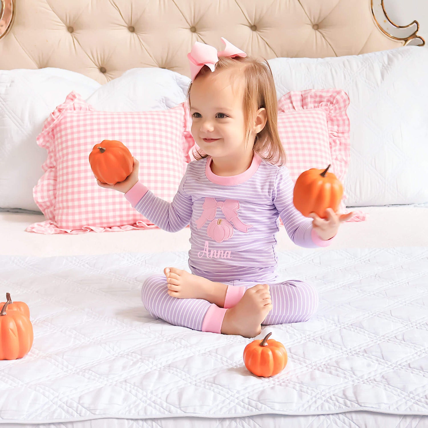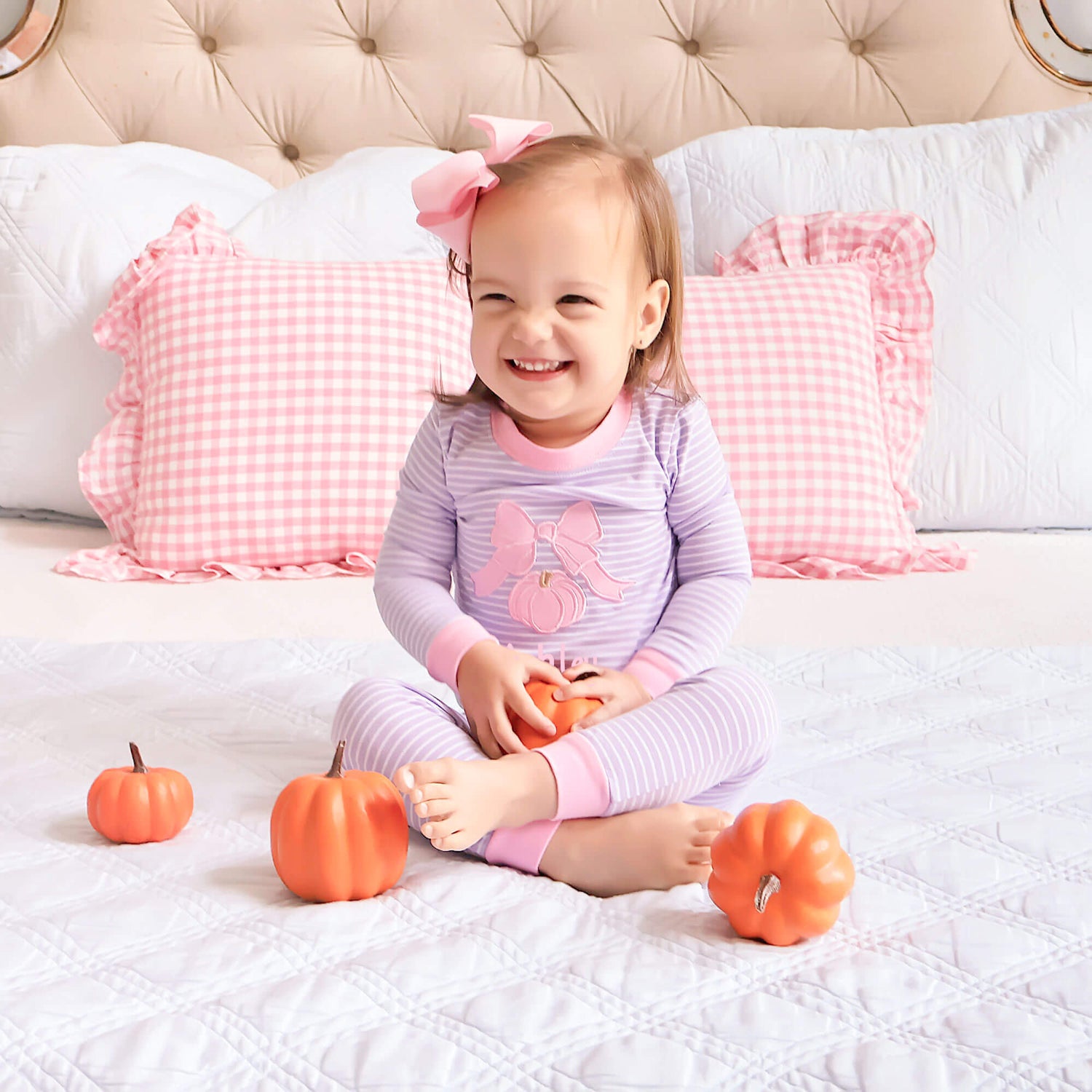 Your little one will be dreaming of the pumpkin patch in our Pumpkin Bow Lavender Stripe Pajamas! This soft lavender stripe set features a long sleeve top with three sweet pumpkins and a bow appliqué, paired with matching pull-on pajama pants. Add a name monogram below the appliqué for a personalized fall touch!