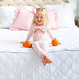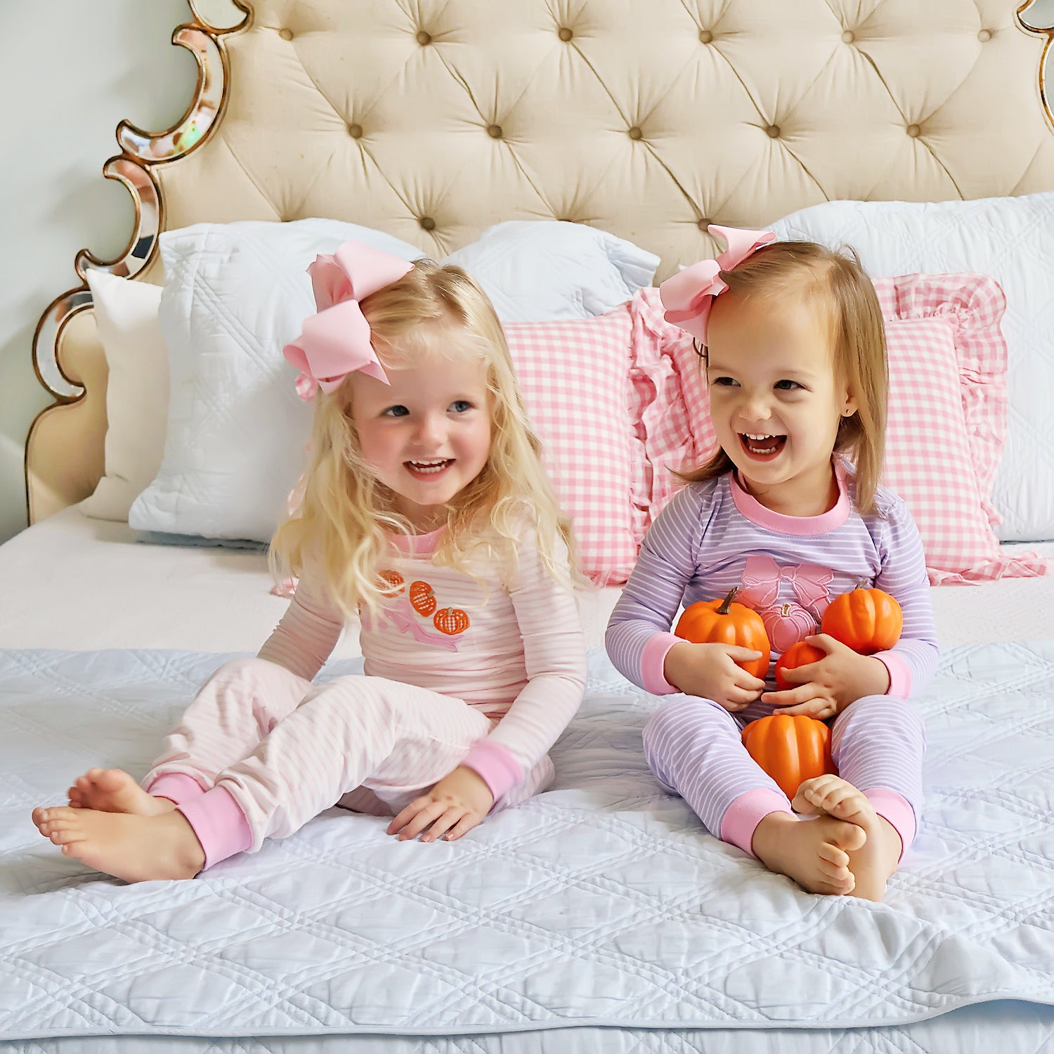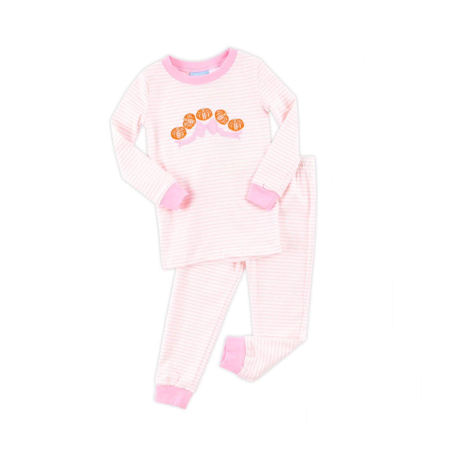 Your little one will be all set for sweet dreams in the Pumpkin Bow Pink Stripe Pajamas! The long sleeve pink stripe top features an adorable pumpkin and bow appliqué with soft pink ribbing for extra comfort. Coordinated with matching pink stripe pajama bottoms, this set is perfect for cozy fall nights. Add a monogram appliqué to make it even more special!