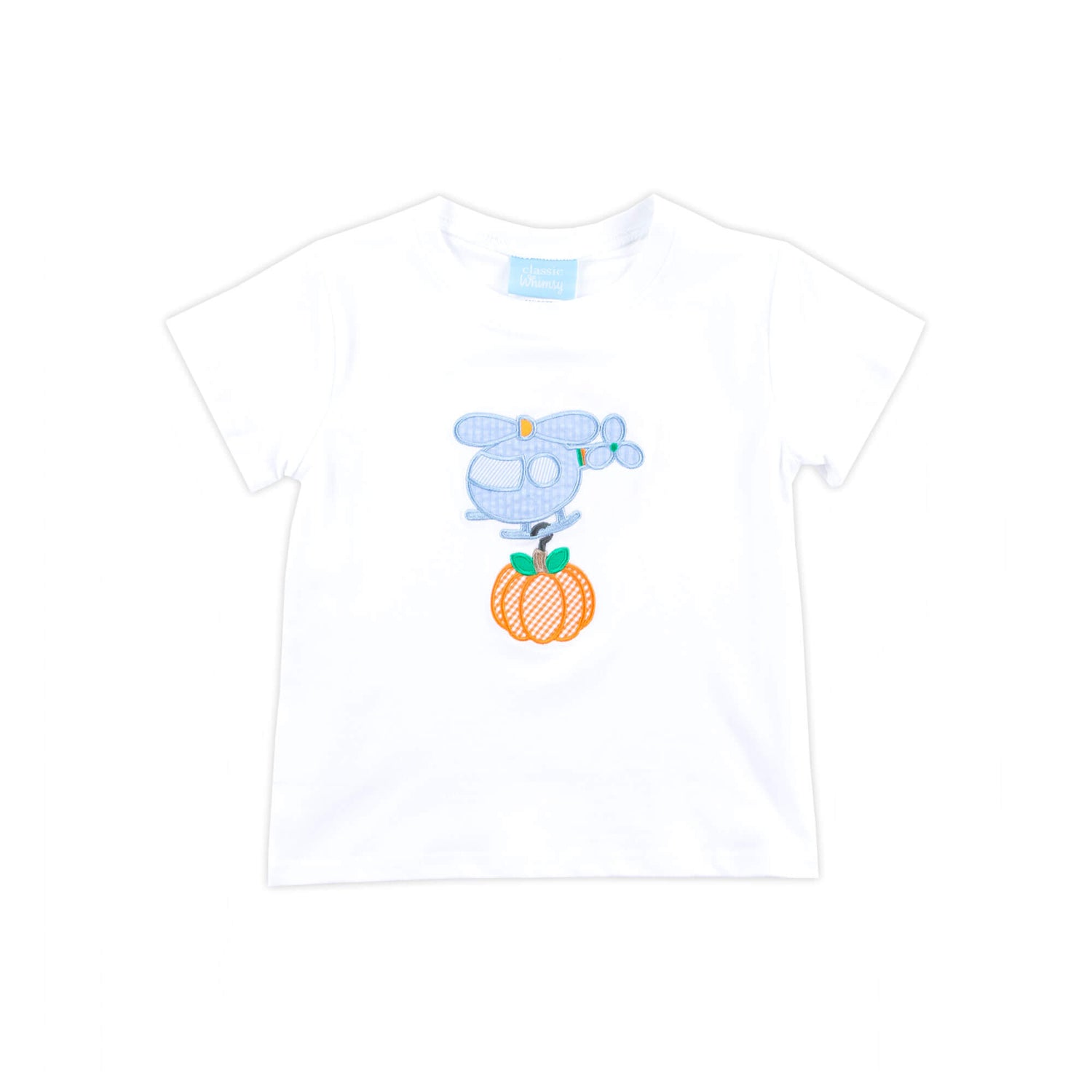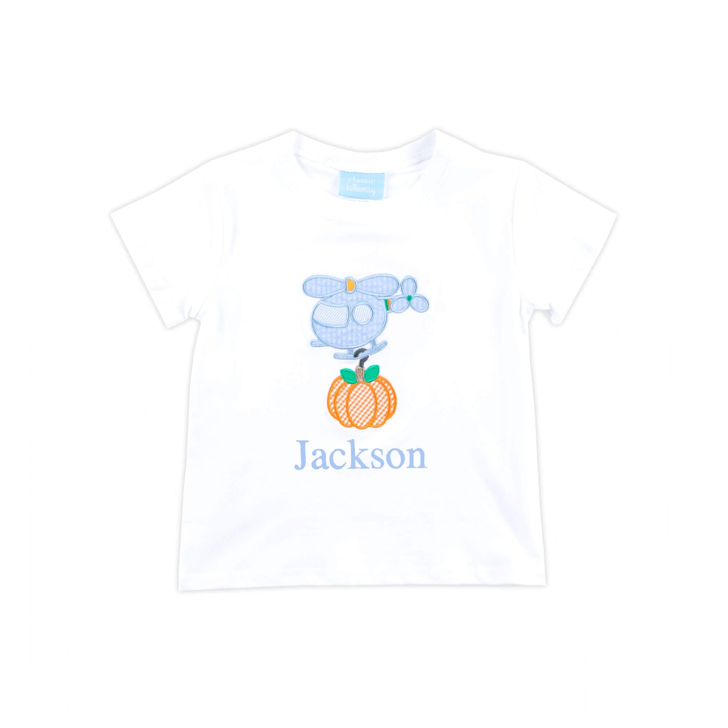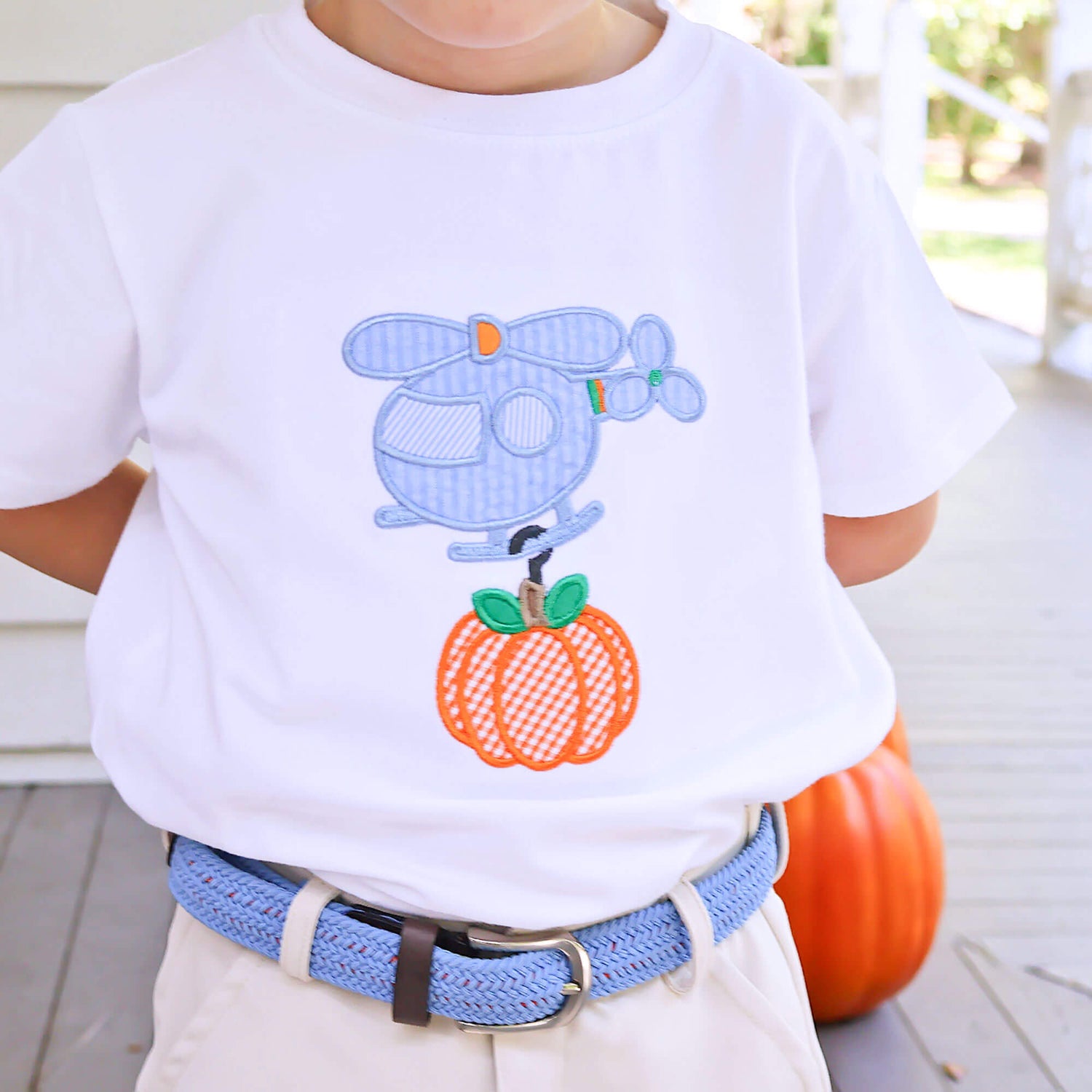 Pumpkin patch season is here, and our Pumpkin Helicopter White Short Sleeve Shirt is just what your little one needs! This white knit shirt features an awesome applique of a helicopter picking up a pumpkin. It's perfect for playtime, comfort, and all-around cuteness! And don't forget to add an initial monogram right in the center of the pumpkin for that special touch.