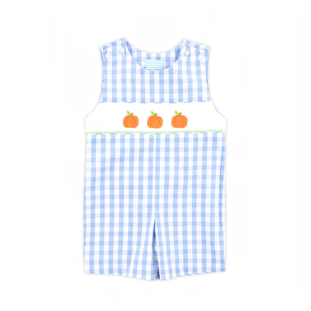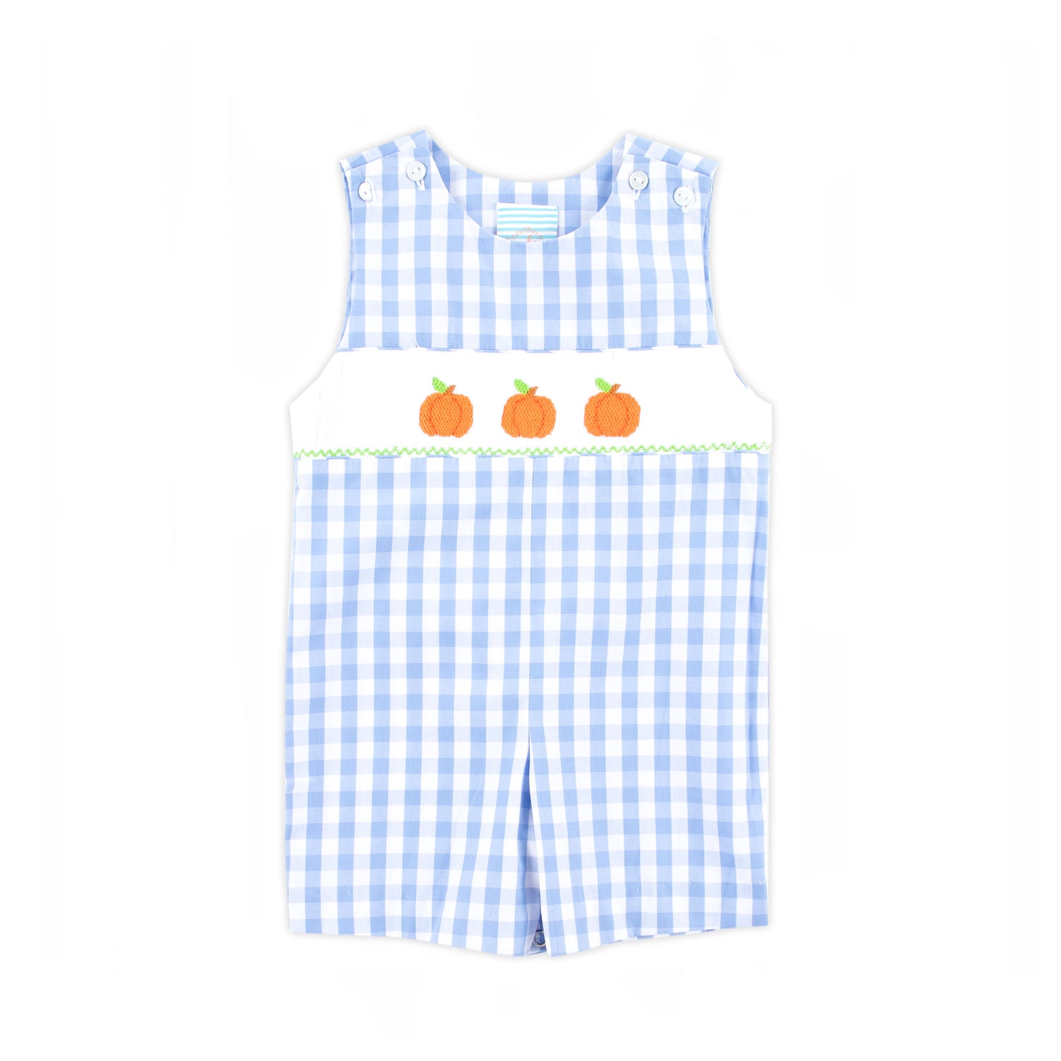 Add this adorable Pumpkin Smocked Light Blue Check Jon Jon to your little one's pumpkin patch collection! Featuring classic hand-smocked pumpkins and a charming light blue check pattern, it's the perfect pick for the season. Designed with shoulder buttons and snaps in stride for easy changes, this sweet Jon Jon is both stylish and practical for all their fall adventures!