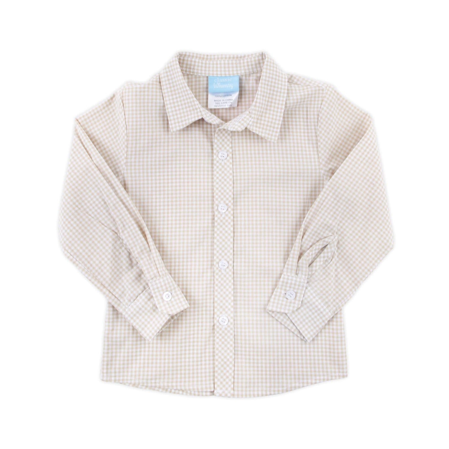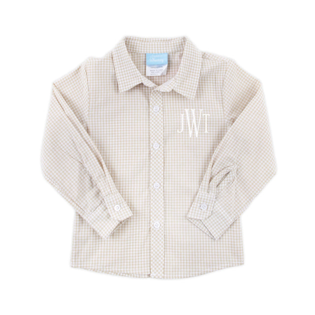 Elevate your little one's wardrobe with our Tan Gingham Button Down Shirt, the perfect addition for the season. This shirt is both stylish and versatile. Ideal for outings to the pumpkin patch, Thanksgiving gatherings, Christmas celebrations, or any special occasion, this shirt is sure to make your little one stand out. Personalize it with a monogram to make it even more special and unique!