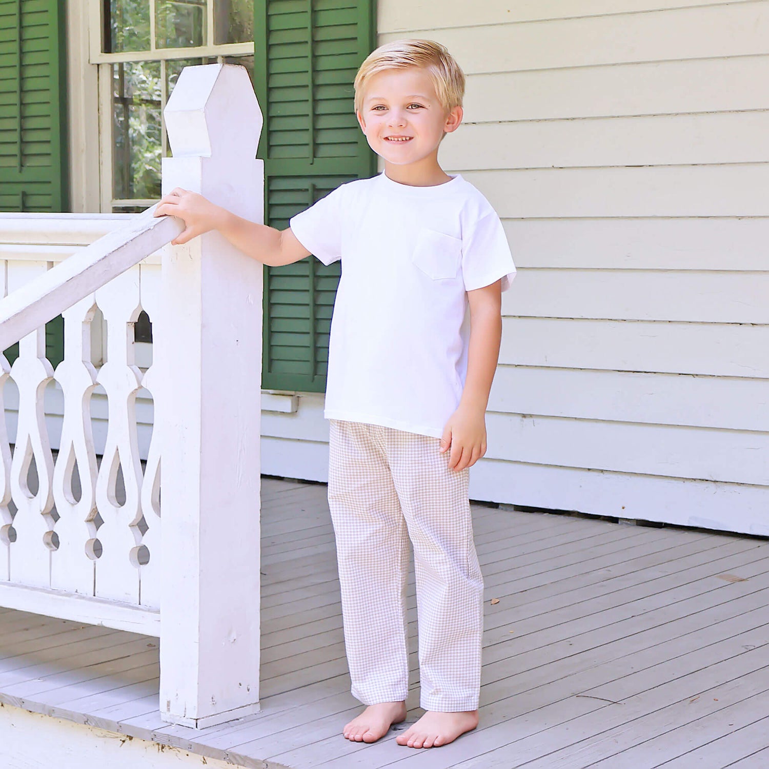 This Tan Gingham Standard Pants are a classic addition to your big boy's wardrobe for year-round wear. Versatile and stylish, they can be paired with your favorite button-down or polo shirt for a timeless look. The classic straight silhouette features slant pockets, back welt pockets, a zip fly with button closure, and belt loops. These pants are perfect for school, church, play, or a collegiate look.