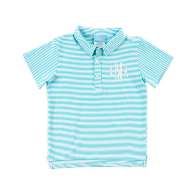 Dress up for playtime in our Turquoise Stripe Polo. This classic knit stripe polo, with its timeless style, allows you to mix and match effortlessly with your favorite bottoms. Perfect for various occasions this spring and summer, this shirt brings a playful touch to any day. Consider adding a monogram to personalize your look and make a statement.