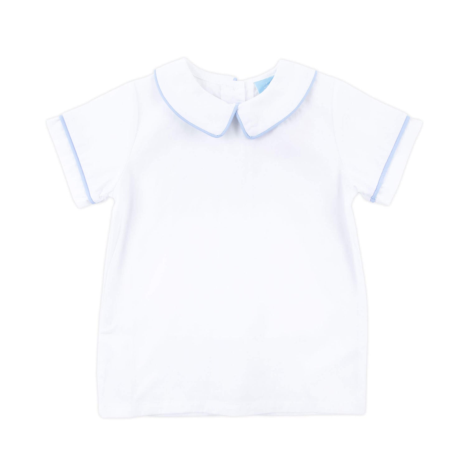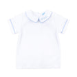 Both stylish and versatile, this White Short Sleeve Undershirt With Light Blue Trim is ideal for layering under longalls or jon jons or can be worn alone with a coordinating short -- in this case, we love a big center 3 Letter monogram! Or personalize it with a name on the collar to make it even more unique.
