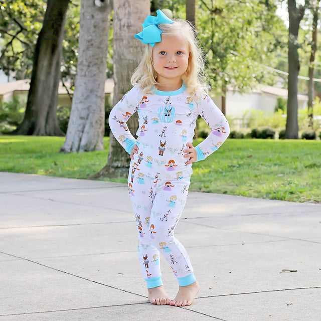 Your little princess will love these adorable Snow Princess Pajamas. So soft and comfortable, this set includes a turquoise trimmed long sleeve top and pull-on PJ pants featuring a scene from her favorite frozen adventure. A perfect weight for all-season wear. Make it extra cute by adding a monogram.