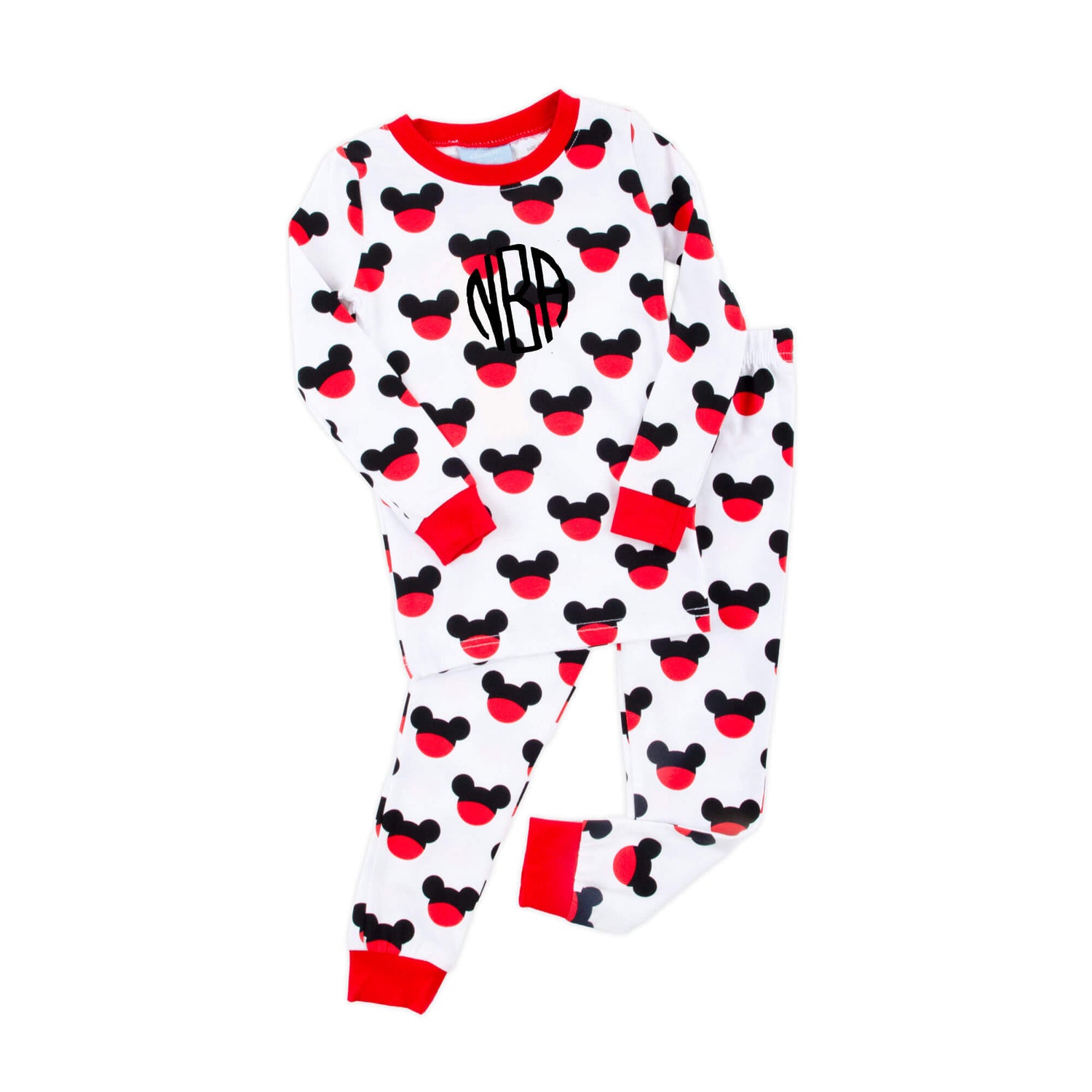The cutest Mouse Ears print knit jammies! This unisex two piece long sleeve PJ set features a repeating Mouse Ears logo and red trim. Super cute for boys and girls -- and for brothers and sisters to match on your next magical vacation! Personalize it with a monogram.