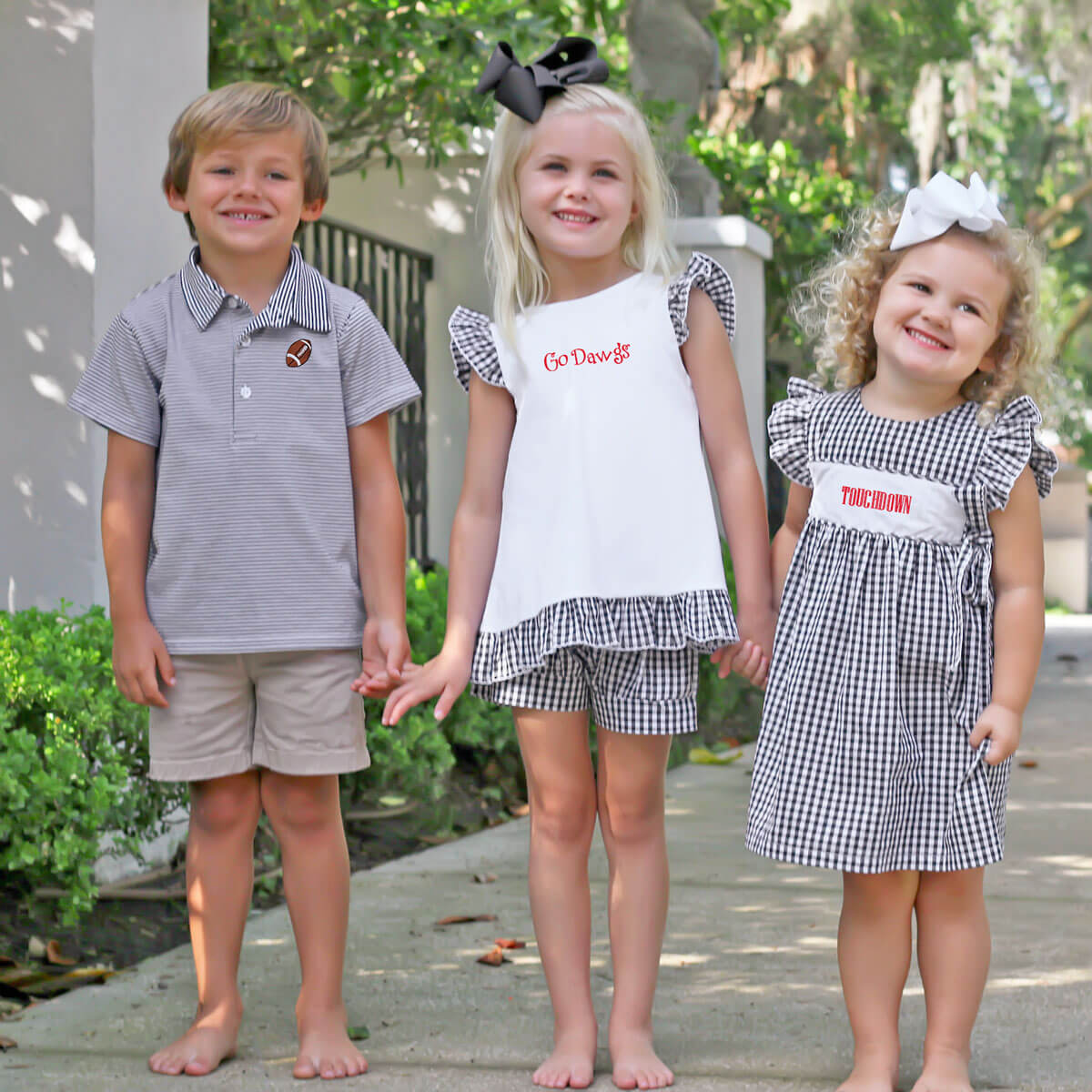 Show your team spirit by wearing this Black Gingham Tie Back Short Set. The white top features black gingham bow and hem ruffles. Coordinated with matching gingham shorts with elastic pull-on waist. Personalize the look by adding a monogram!