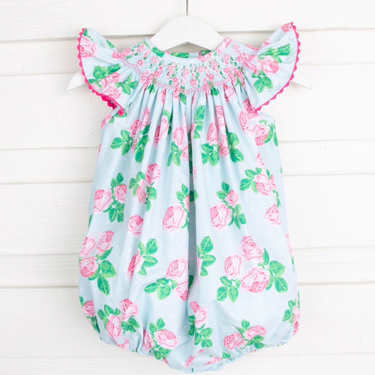 Exclusive to SA! Light turquoise background with white polka dots. Printed pink roses. Cnady pink ric rac along angel sleeves. Snaps in stride.