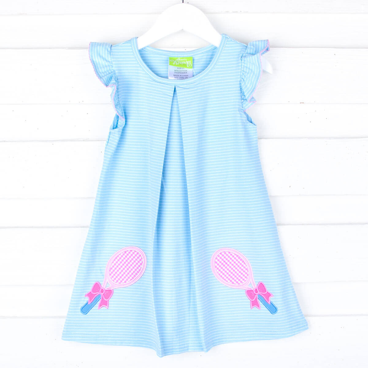 Gear up your future tennis partner with the charming Tennis Appliqué Claire Dress. This A-line dress in blue stripe knit features a center pleat and two delightful tennis racquet appliqués complemented by flutter sleeves adorned with pink picot trim.