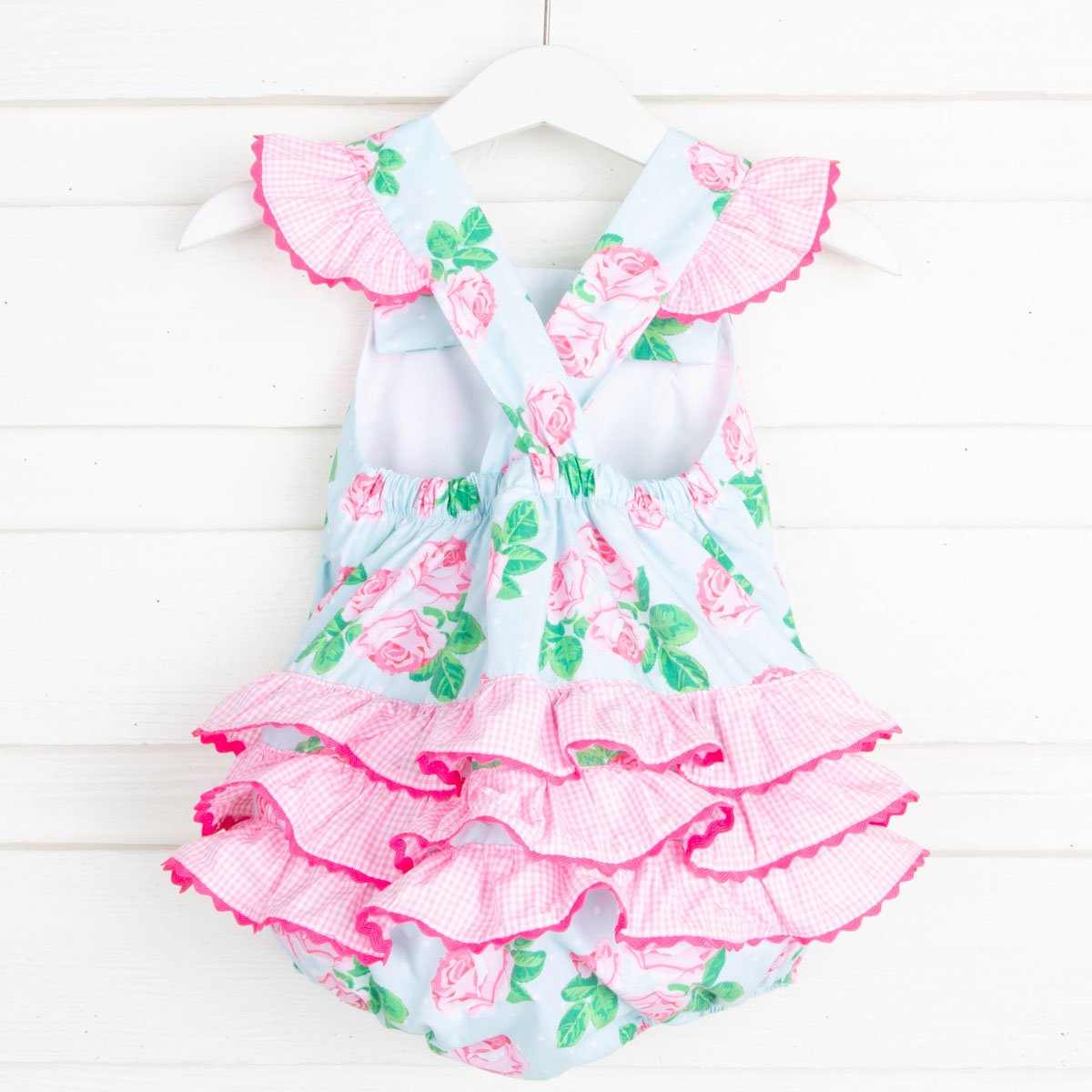 Light turquoise background with white dots. Pink printed roses. Light pink gingham ruffles in the back. Hot pink ric rac. Snaps in stride.