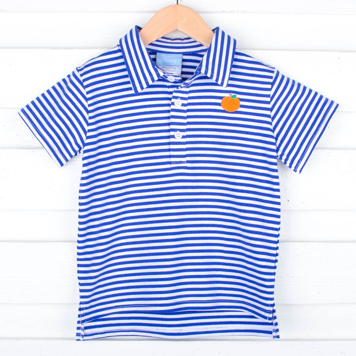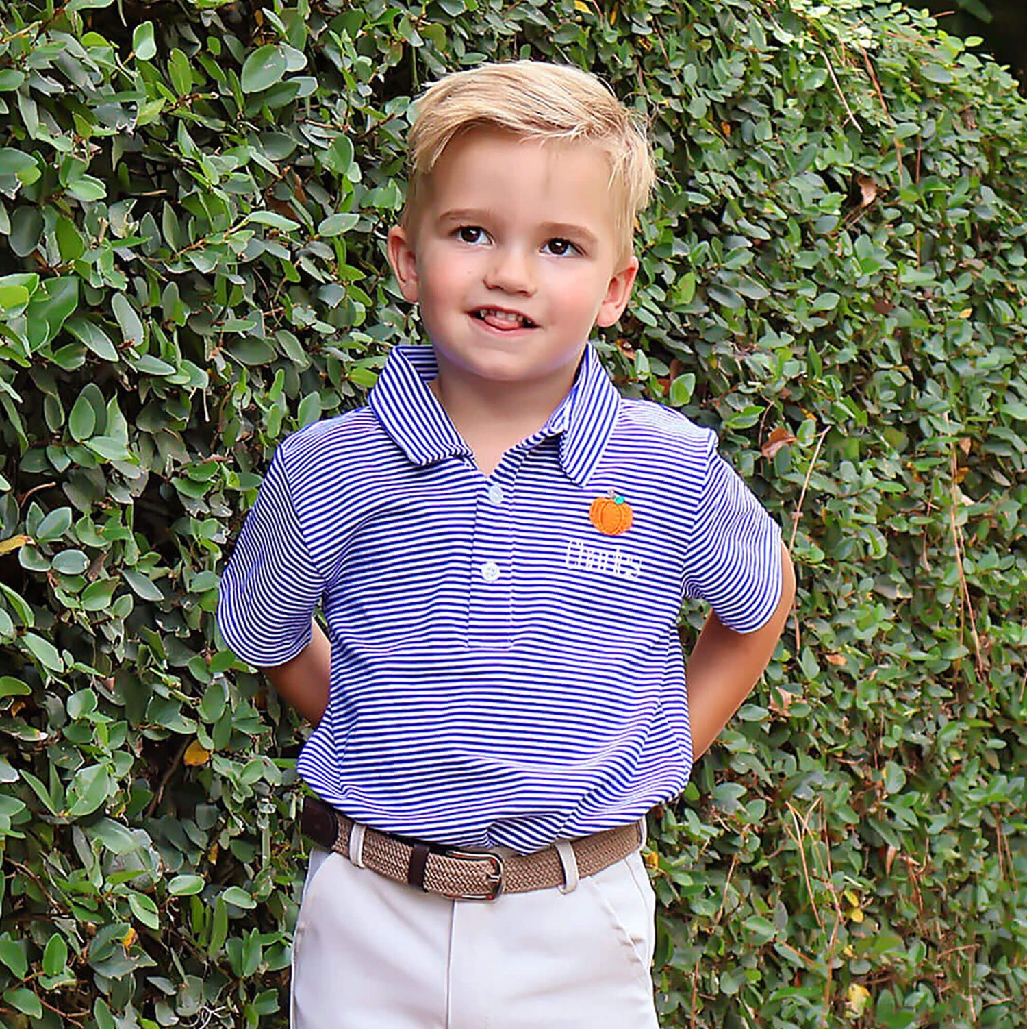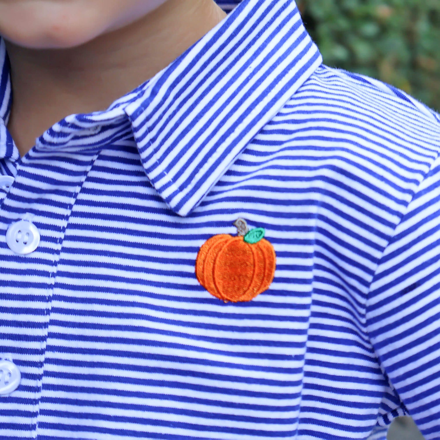 Your little one is guaranteed to be the cutest pumpkin in our Pumpkin Embroidered Blue Stripe Polo Shirt. This blue stripe knit polo features an embroidered pumpkin on the side. Mix and match it with your favorite bottoms. It’s the perfect polo for playtime fun, comfort, and cuteness! Add a monogram below the pumpkin to finish the look!