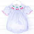 How sweet is this Cherry White Smocked Bishop Bubble in a charming tiny blue swirl print. This delightful outfit features smocked bright pink cherries, along with bishop-style sleeves trimmed with pink picot. Snaps in stride for convenient dressing.